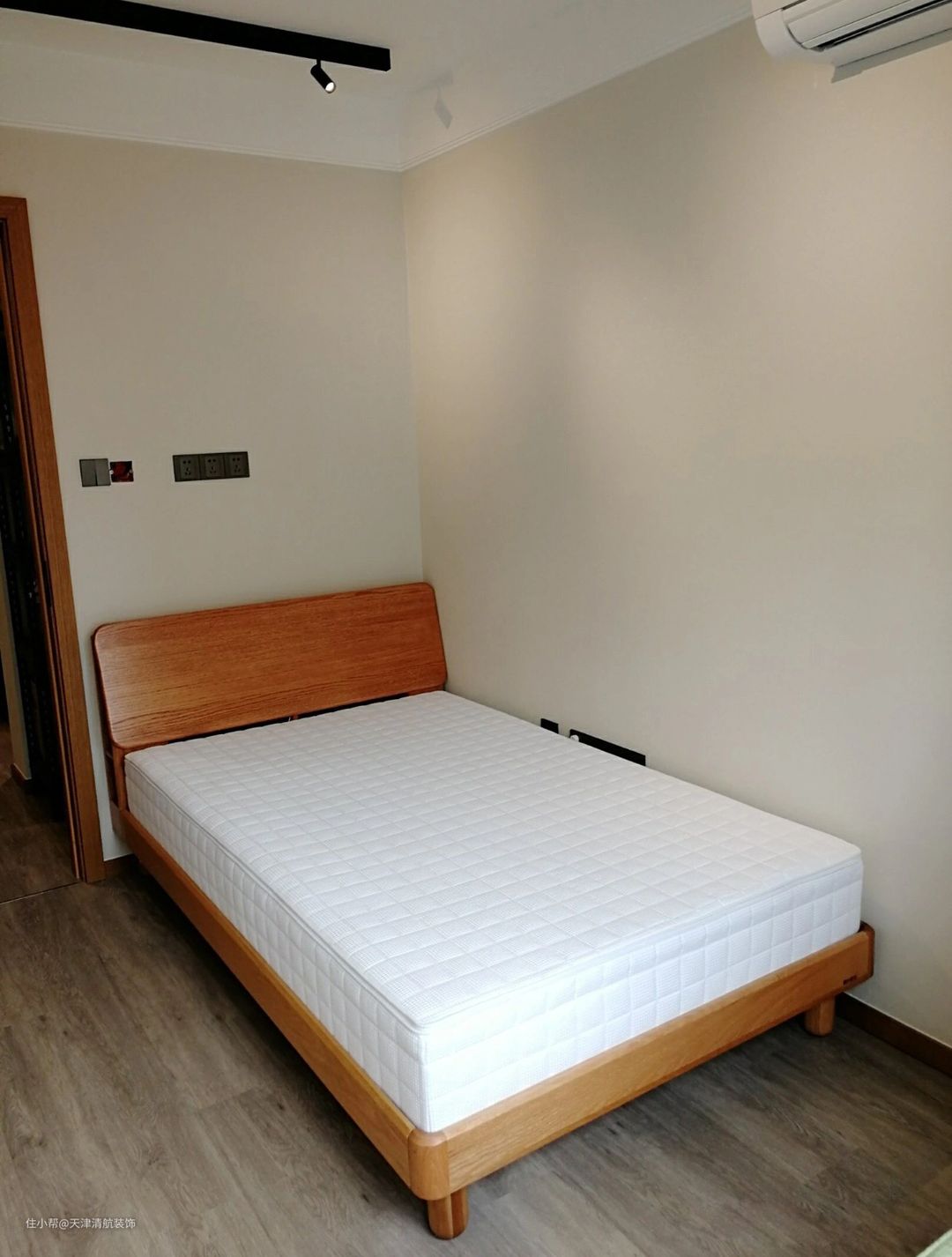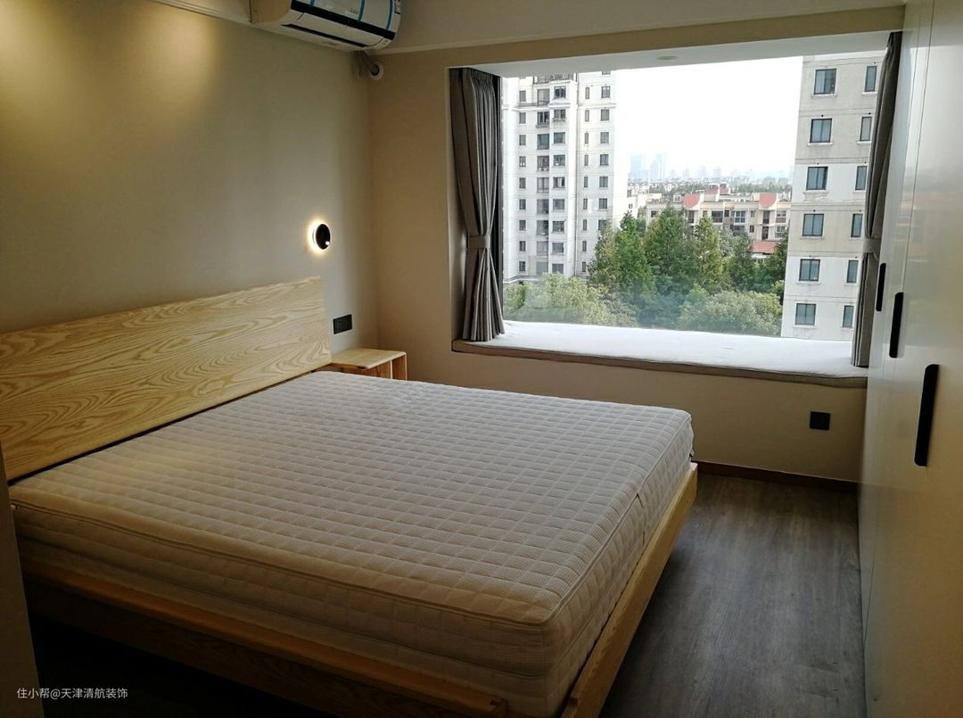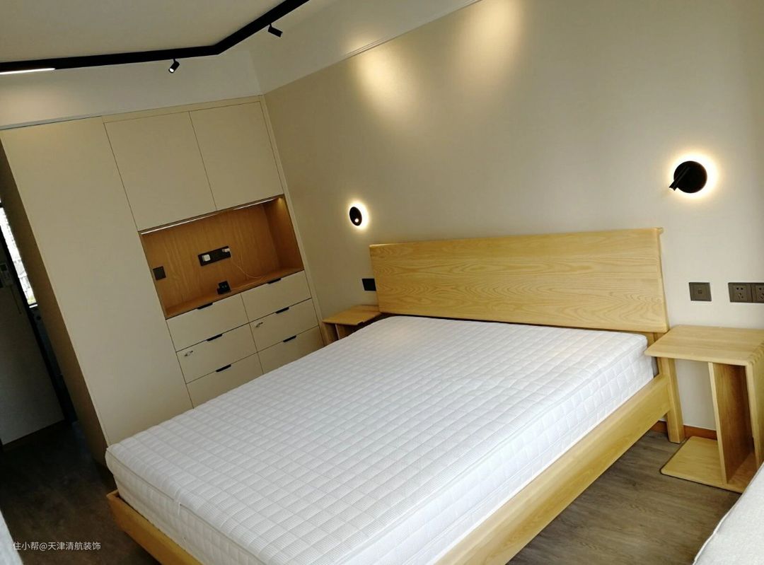 主卧非常简单,没有做背景墙。定制的衣柜直接到顶,中间留空位置,安装了插座,需要使用的时候,方便很多。顶面安装了轨道射灯,增加室内采光,包括床头两边的壁灯,真心喜欢。布置了原木色的双人大床,床垫睡着特别舒服。飘窗很大,放着坐垫,可以当小沙发使用。
