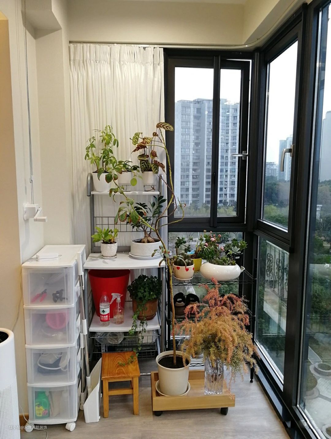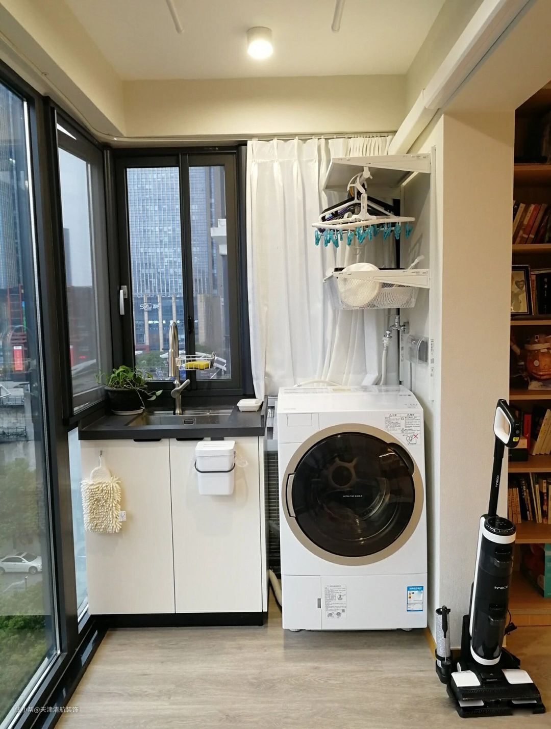 阳台一边放着植物和一些杂物,都方便收纳起来,还是蛮不错的。另外一边定制了非常实用的洗衣柜,旁边放着洗衣机,大小位置合适。在这里晾晒衣物的时候,方便很多。大大的落地窗,光线很好。
