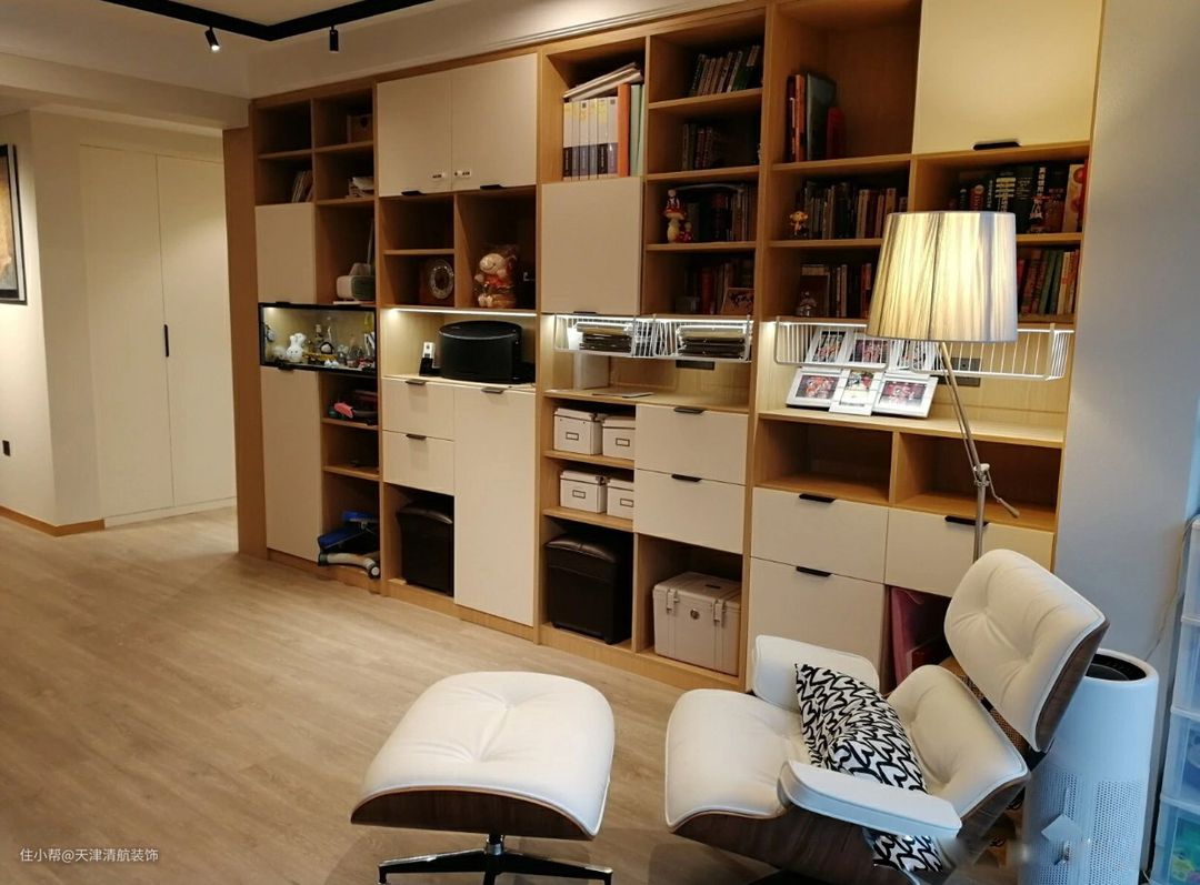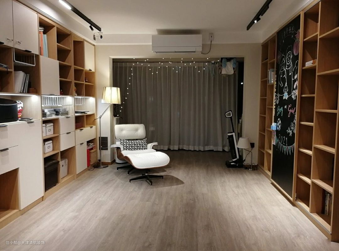 另外一边的书架,不规则安装了柜门,局部是没柜门的,显得比较个性,好看。不管是装书还是其他,都很实用。地面铺木地板,没有瓷砖那种冷冰冰的感觉,非常舒适。如果你家也有这样的需求,可以学这种不常规的设计,太实用了。