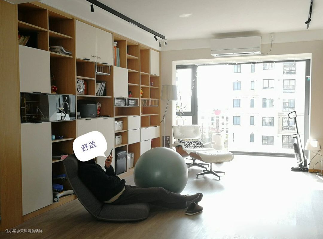 客厅不常规设计,个性又实用!可以看到,没有电视柜,没有电视背景墙,更没有沙发背景墙,没有茶几,没有沙发,相信很多人都第一次见这样的设计吧!两边都打满了书柜,可以提供非常充足的储物空间,堪比多一间房还实用。布置了无腿凳,坐着更舒服,类似躺着一样,不管是看手机还是看书,都很方便。