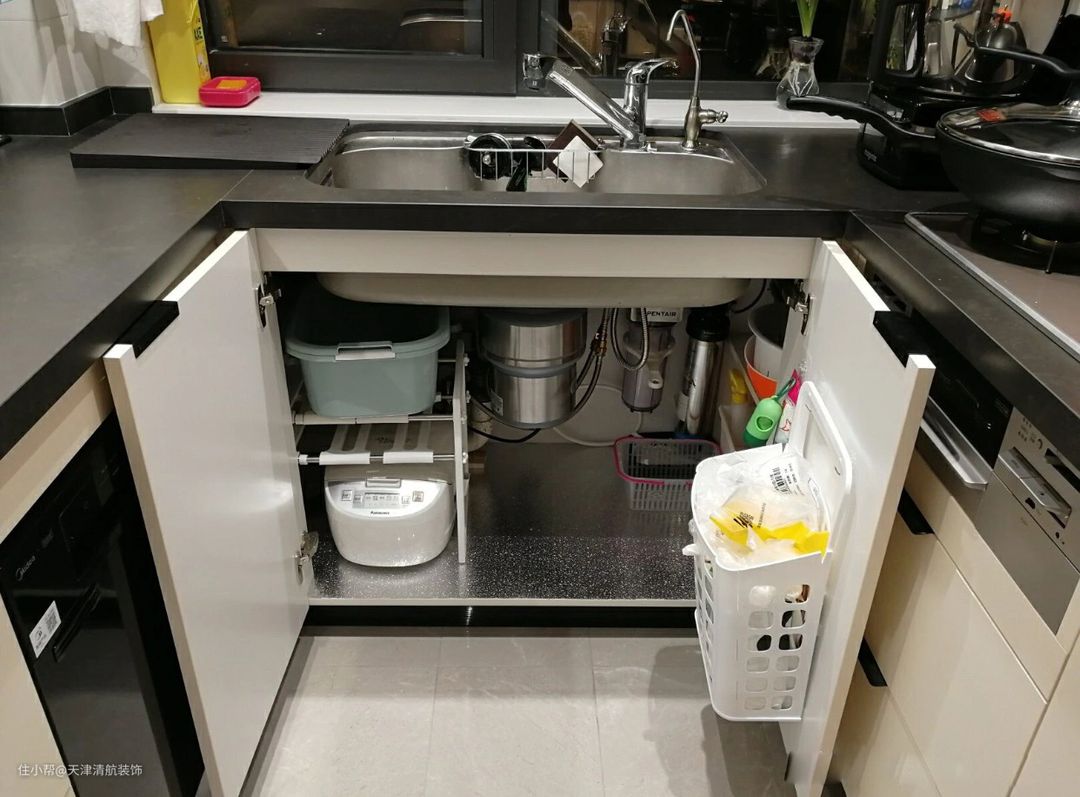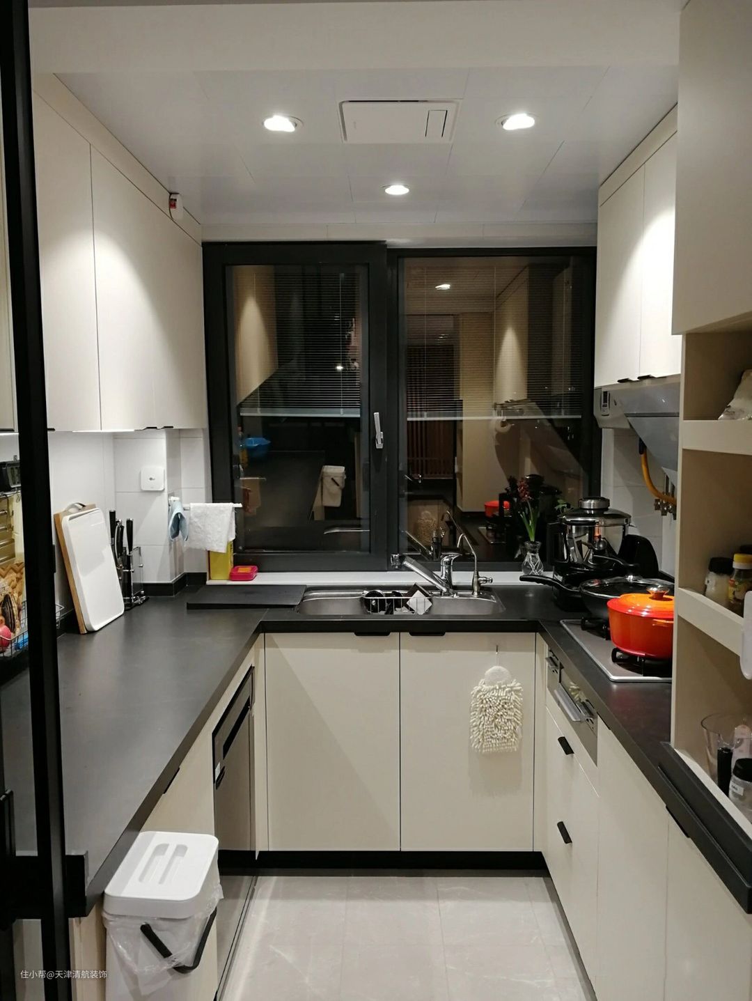 厨房空间不大,定制了“U”字型的橱柜,两边各60CM的台面,不过中间为100COM,平时一人在厨房操作的时候,非常方便。不过,假如多一个人的话,稍微有点拥挤了。安装了洗碗机,5个大抽屉,可以提供大量的储物空间。水槽下面安装了垃圾处理器,净水器等,都非常方便使用。