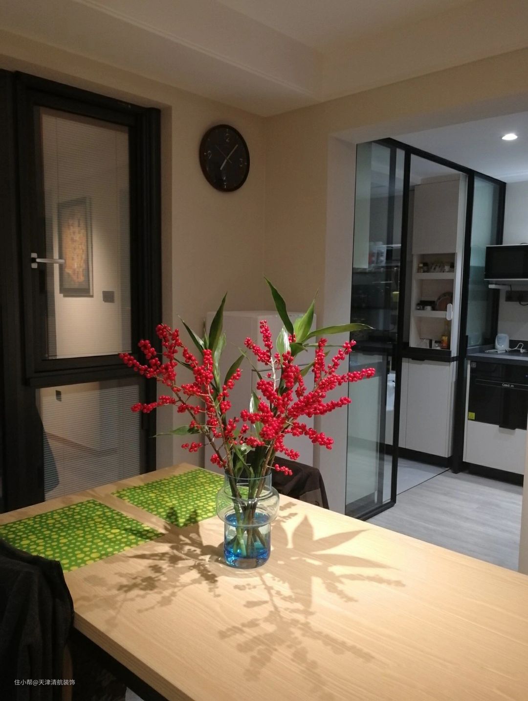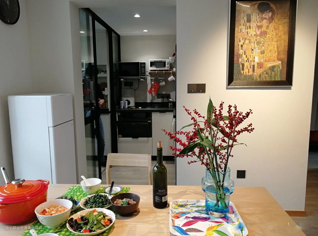 平时就屋主夫妻两人,加上一个未出生的宝宝,其实也是一家三口。不管工作多忙,屋主都会选择在家吃饭。摆上花做装饰,显得非常喜庆,装饰性很强。在灯光的衬托之下,很舒适,也很温馨。旁边进去就是厨房了哈!