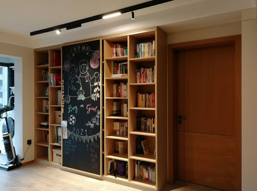 这边定制了一排的书架,其中中间留空位置做了一面的黑板墙,可以方便家里小家在这里涂涂画画,并且两边都有很多书籍,需要看的时候,方便很多。以后家里小孩,可以从小学会爱阅读的好习惯。没有电视机,真的很少见啊。