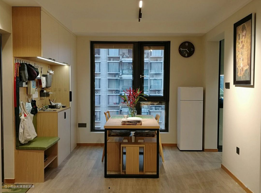 入户鞋柜稍微占用的餐厅一些位置,所以布置了一张方形餐桌,大小位置合适。平时的餐椅往餐桌底下收纳起来,显得空间特别宽敞。在这样的小餐厅用餐,不影响哈。有个窗户,白天的时候采光还是蛮不错的。