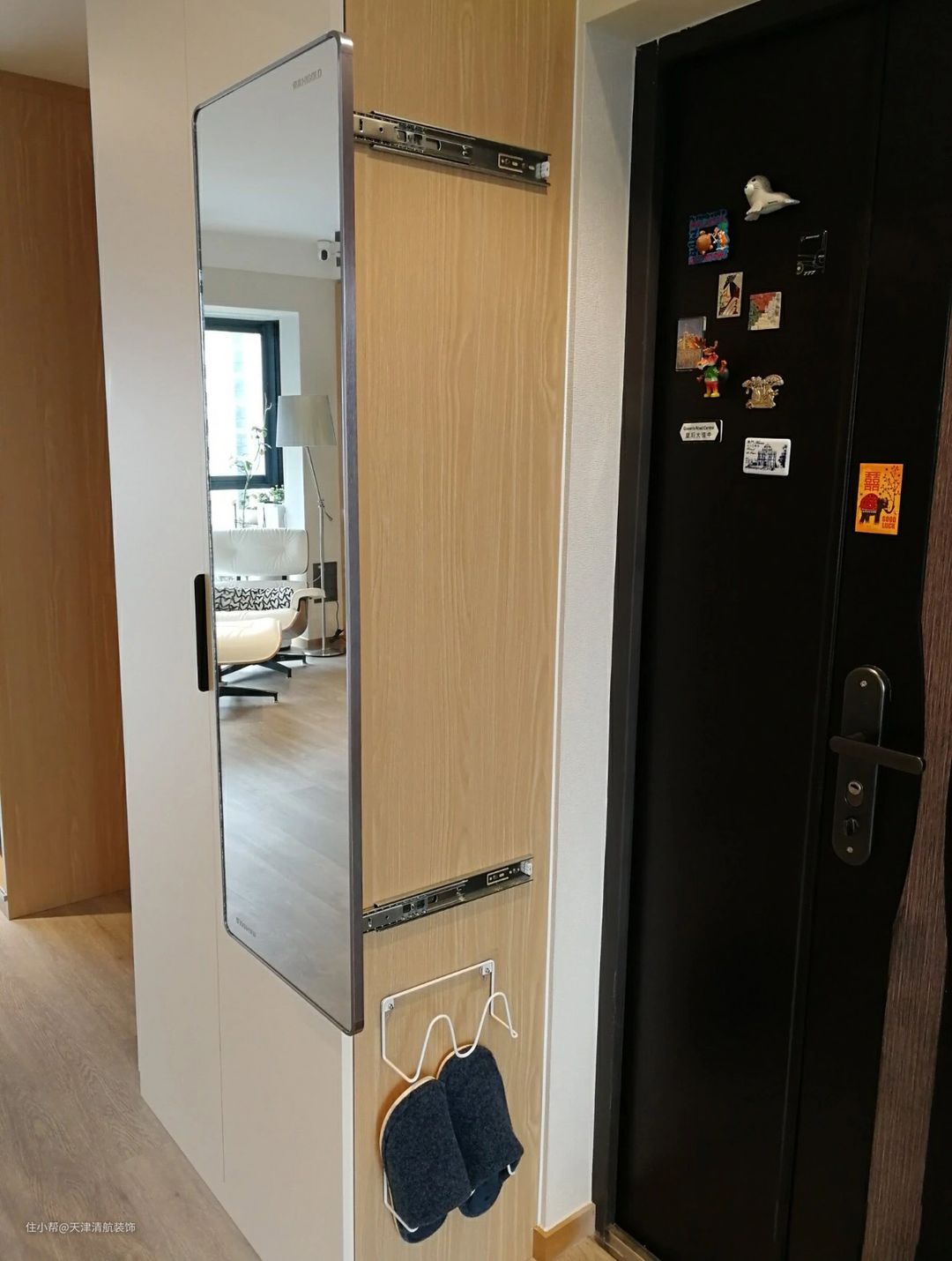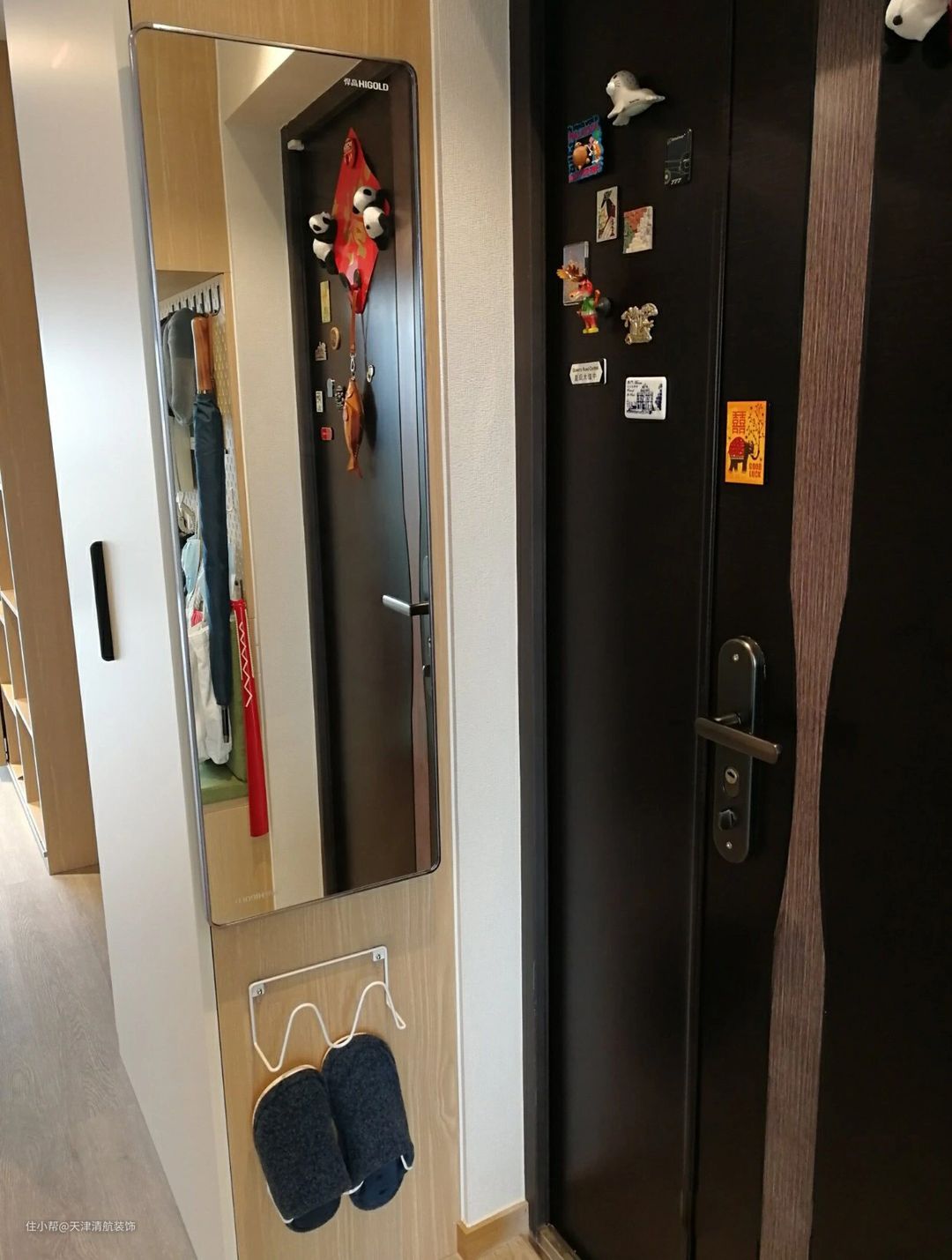 大门另外一边安装了全身镜,进出门的时候,可以通过镜子的作用,整理穿着。镜子相当于折叠的方式,打开使用不会受到任何影响。并且还安装了鞋架子,可以翻遍挂鞋子,细节处理很好,半点空间舍不得浪费,很值得参考。