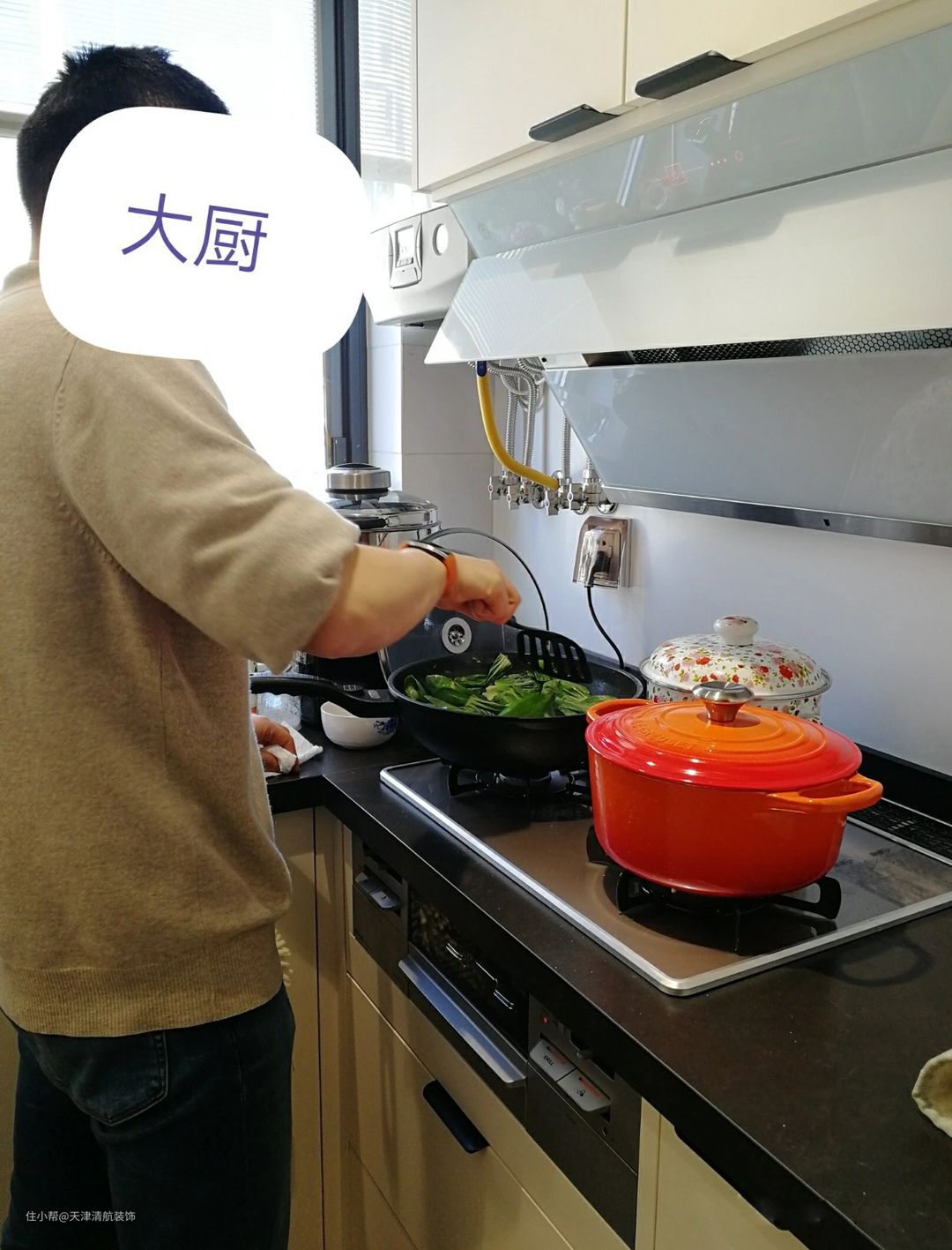 男屋主在厨房忙活的样子,真的太帅气了。在家里做饭菜,其实是一种幸福,尤其是自己辛辛苦苦换来的房子,辛苦装修出来的房子!安装了黑色岩板台面,特别耐脏。