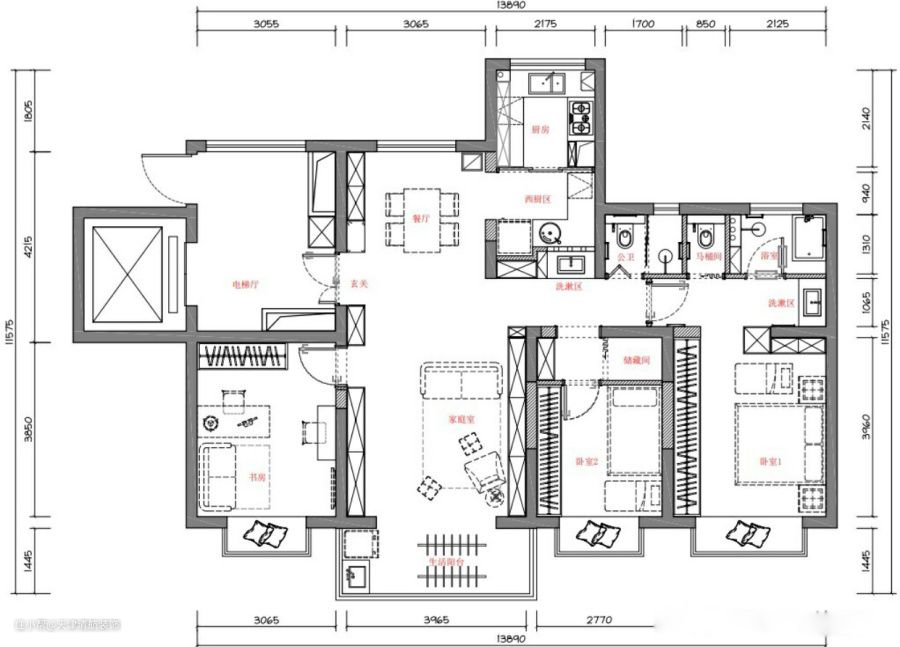 准确说,这是改造之后的户型图,一梯两户的房子,所以从电梯出来,其实就是自己的入户门口了,中户型图大家可以看出来。家里没有玄关,所以打造客餐厅一排整体的地柜,一整排的书架、黑板、鞋柜等为一体的柜子,弥补没有玄关的户型。并且卫生间做了三分离,更方便使用。