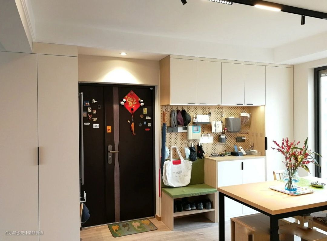 设计的入户鞋柜自带换鞋凳,可以非常方便坐着换穿鞋子。同时,鞋柜中间安装了洞洞板,颜值很高,也很实用。,很多小物件的东西都方便挂在洞洞板上,更灵活使用,让人见到,都会很喜欢。即使没有独立的入户玄关,只要合理利用起来,鞋柜总会有的。