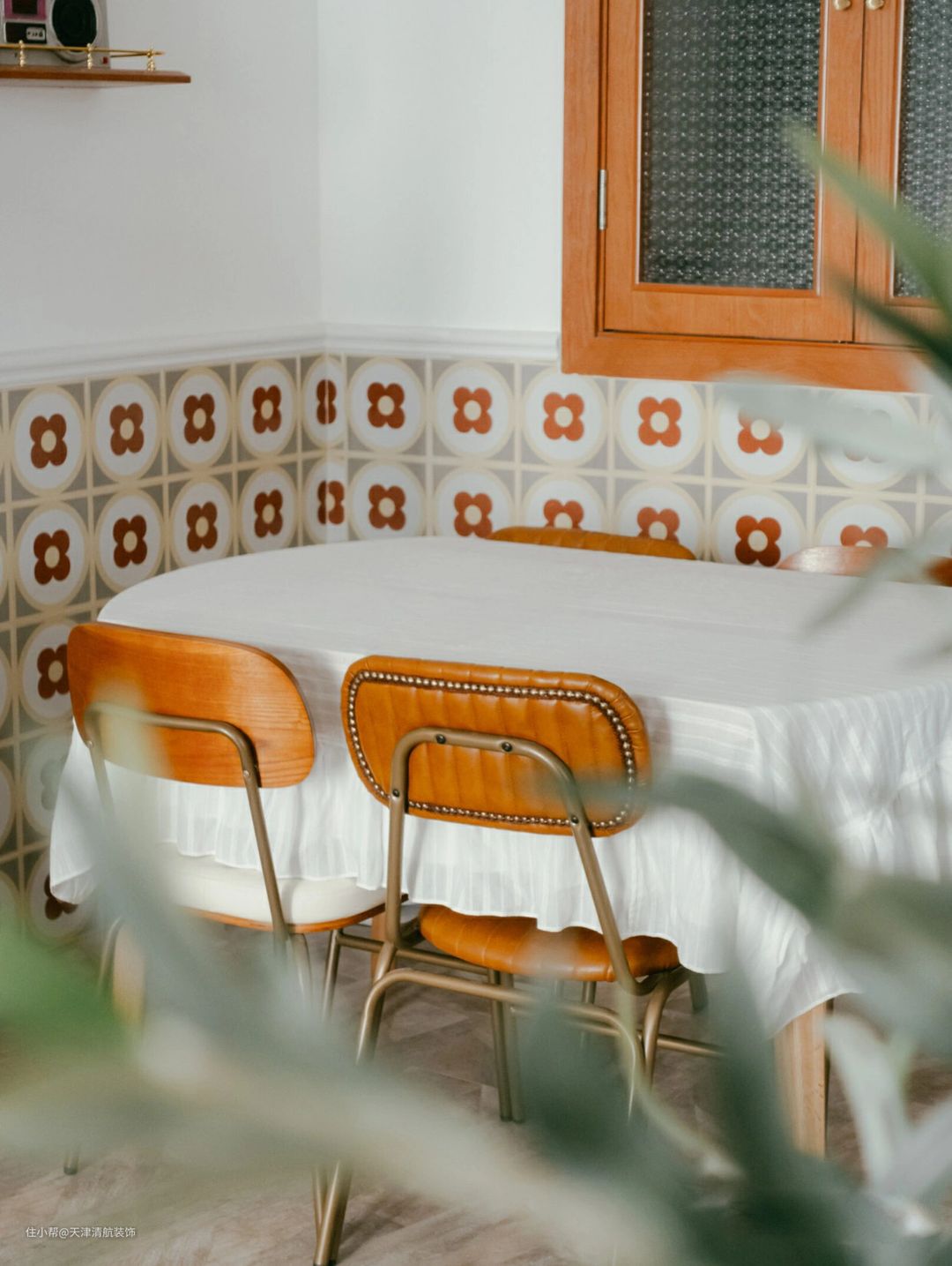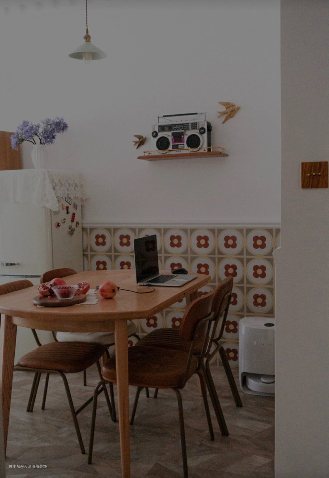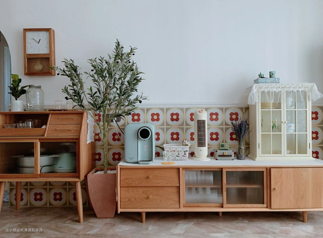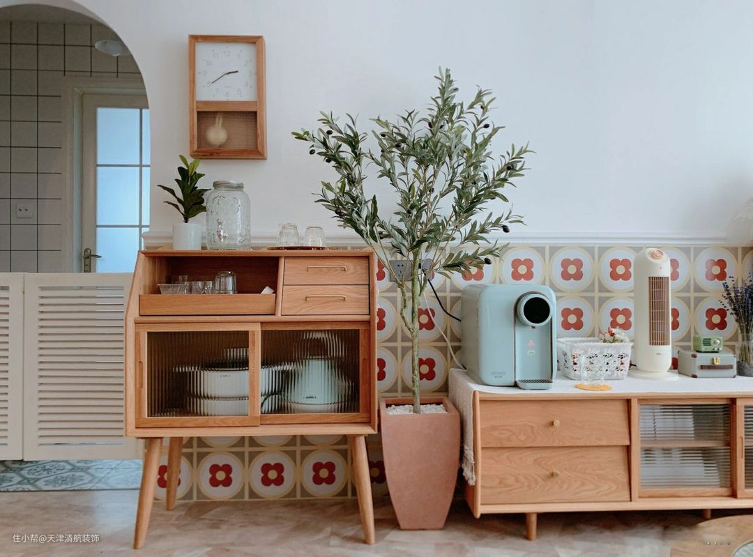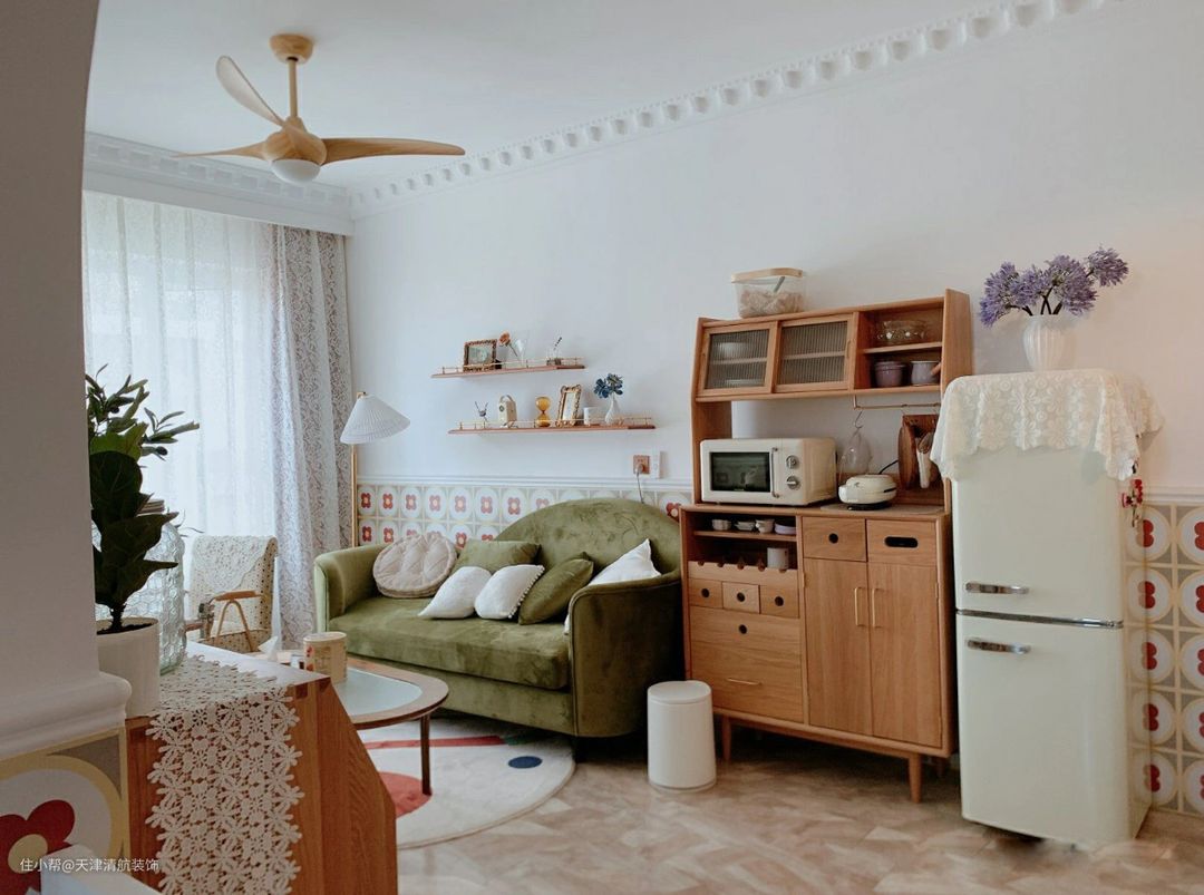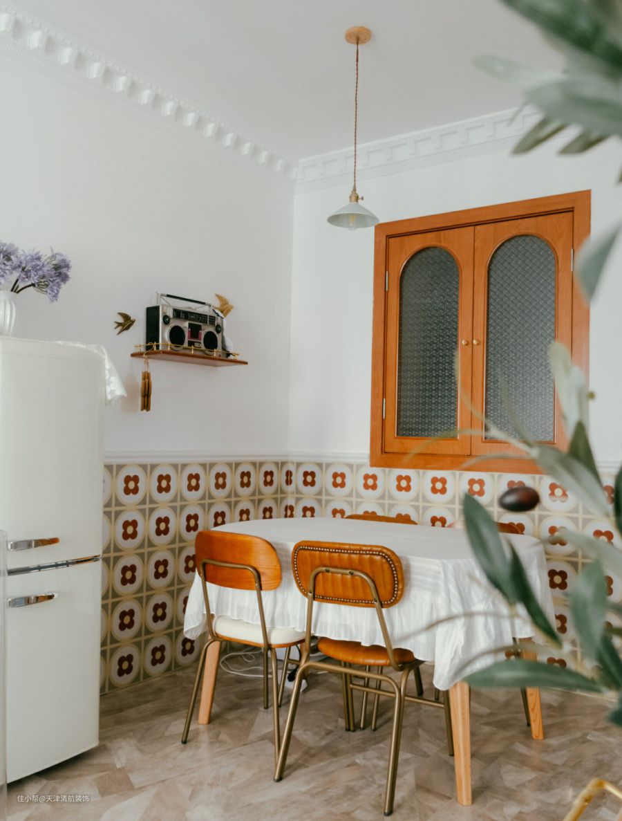 顶面是不做吊顶,仅仅走了一圈石膏线条代替吊顶,简单又好看。为了效果没有那么单调,墙上贴了1.1高的花墙砖,可以起到很好的效果,并且刚耐脏,视觉上还蛮大的哈。全屋都是屋主自己设计,包括全屋的搭配,真的很羡慕。没有吊顶的话,显得楼层比较高挑,虽然看看简简单单,但是也很有层次,太喜欢这样的装修了。