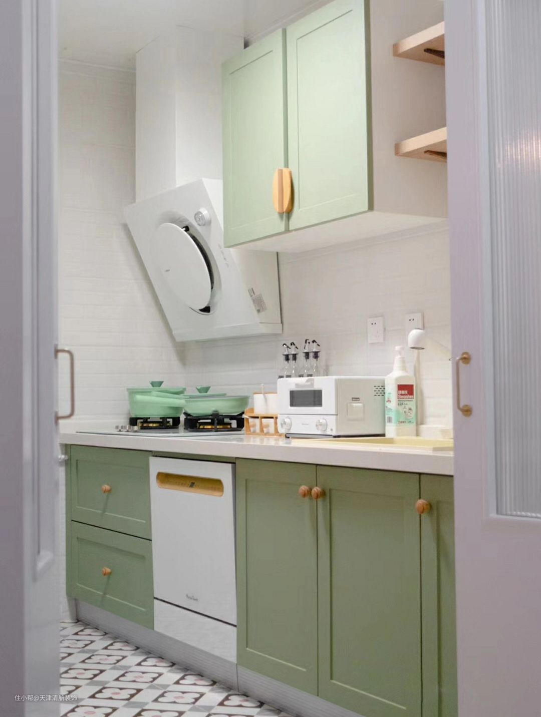 厨房空间布置,定制了草绿的橱柜,包括一些锅都使用绿色,真心漂亮极了。可以看出来,其实女屋主还是有点少女心啊。分享于互联网,不代表公司任何立场,不承担任何责任如侵删。