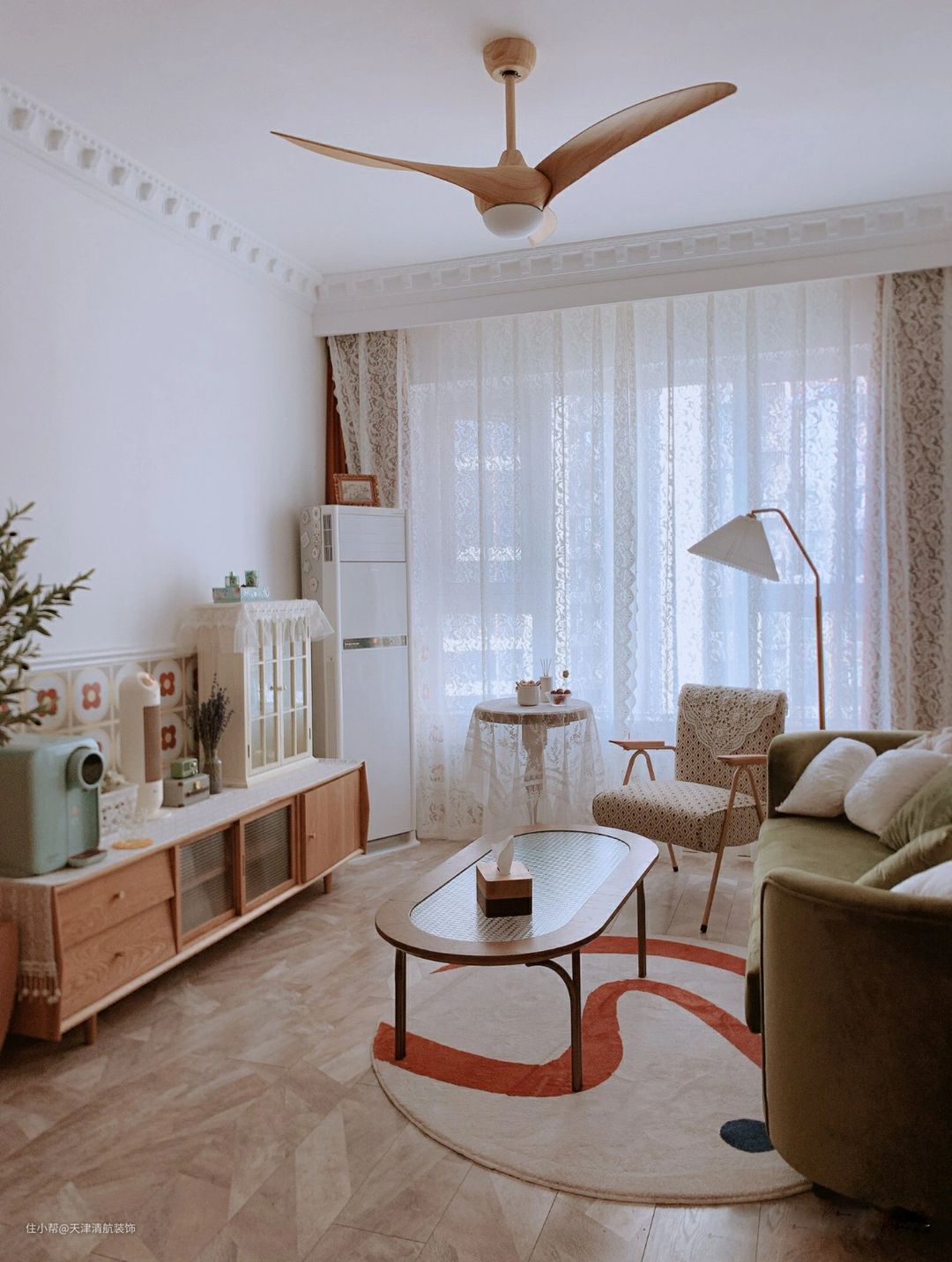 客厅顶面是安装了实用性很强的风扇吊灯,既可以起到照明的作用,还可以当风扇使用,视觉上还可以起到装饰的效果,真心让人喜欢。茶几地面放着一张地毯,能弥补简简单单的硬装部分,其实更符合“轻装修重装饰”的家居设计理念。虽然没安装吊顶,但是也做了窗帘盒,更大气,效果更美观。