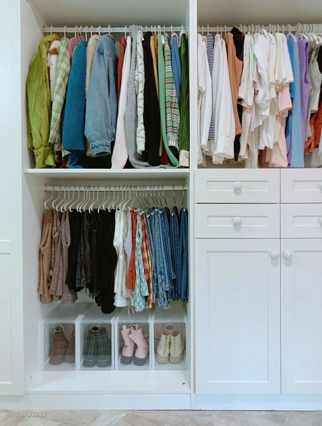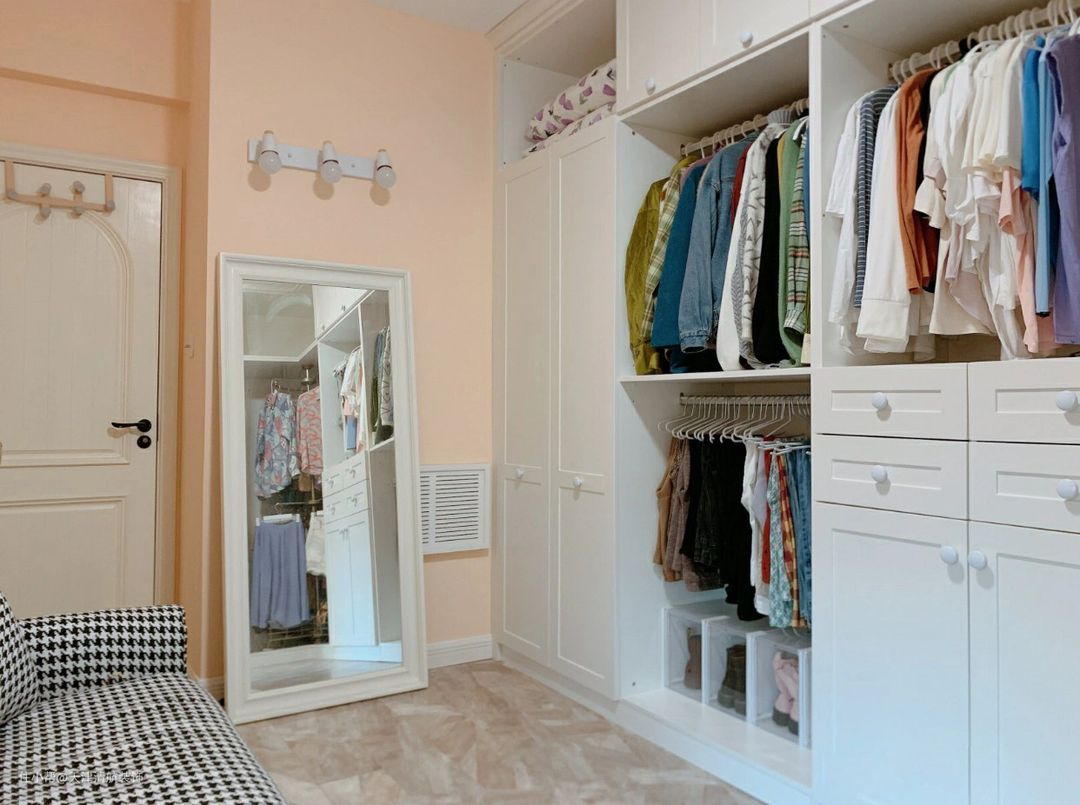 对于一个女性来说,家里能拥有一个独立的衣帽间,真的很幸福,很多漂亮的衣物,包括鞋子等等,都可以非常方便收纳起来,真心不错啊。衣柜全白色,显得很干净。一些没有安装柜门,不影响使用。