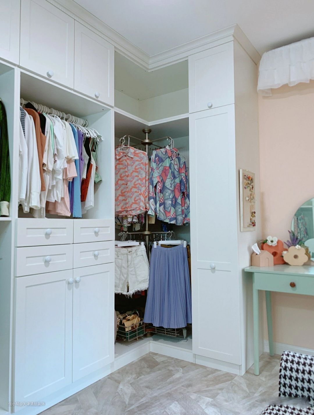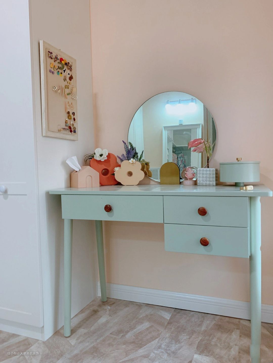 梳妆台也是屋主的最爱了,在这里可以美美梳妆打扮。每次使用,都会尽量收拾干干净净,整整齐齐,下次使用,心情都很开心。