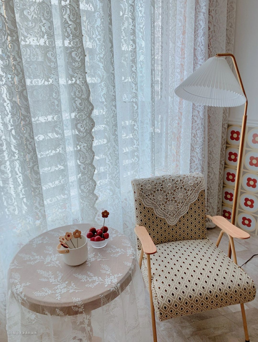 客厅阳台摆放着休闲椅,在这里坐着吃点水果或者零食,或者在这里坐着玩玩手机看看书,都觉得很幸福,也是一种享受。类似蕾丝一样的窗帘,特别美观。