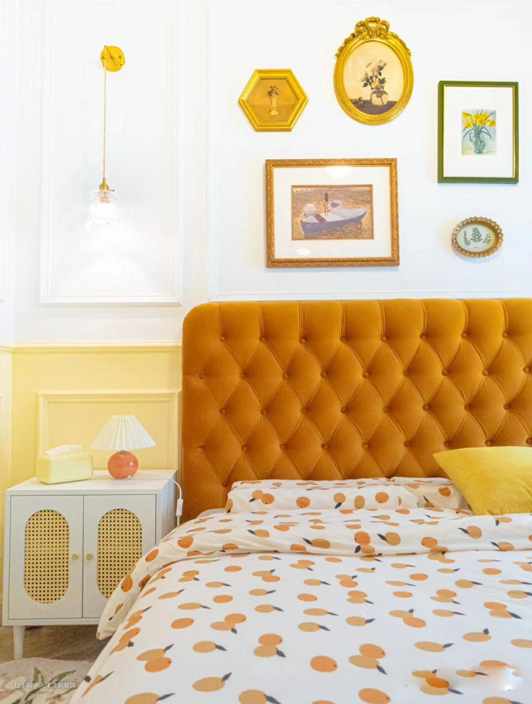 主卧的效果更有法式风格的味道,搭配出来的效果特别舒适,特别甜,有种像是恋爱的感觉了。橘黄色的床头背靠,搭配了一些花纹非常漂亮的床上被套,包括连选择的床头柜颜值都很高,看着都羡慕。