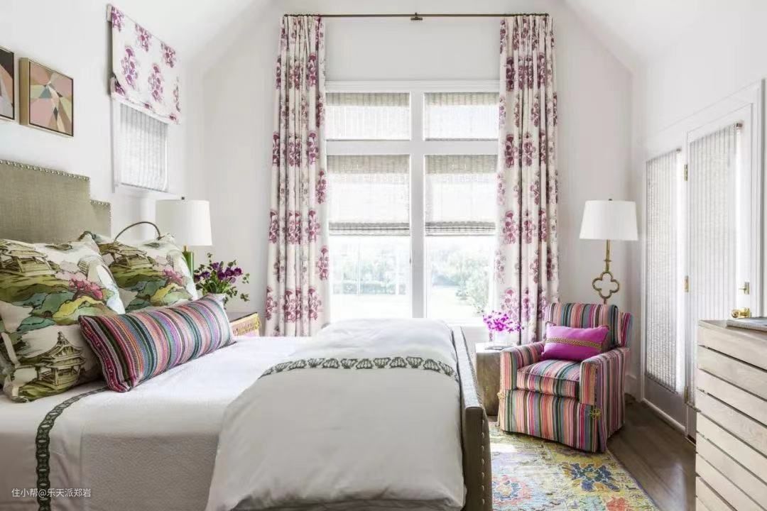 以纯白为背景,对比色互为点缀,就像是一首色彩碰撞的小夜曲。在这间卧室中,干草色的亚麻布艺床头板与兰花紫印花窗帘相辅相成,打造出一个散发出精灵气息的卧室。精美的印花地毯、抱枕以及装饰画都散发着精致、细腻,条纹沙发与抱枕相呼应,用布艺装饰的床头柜则散发出复古气息。