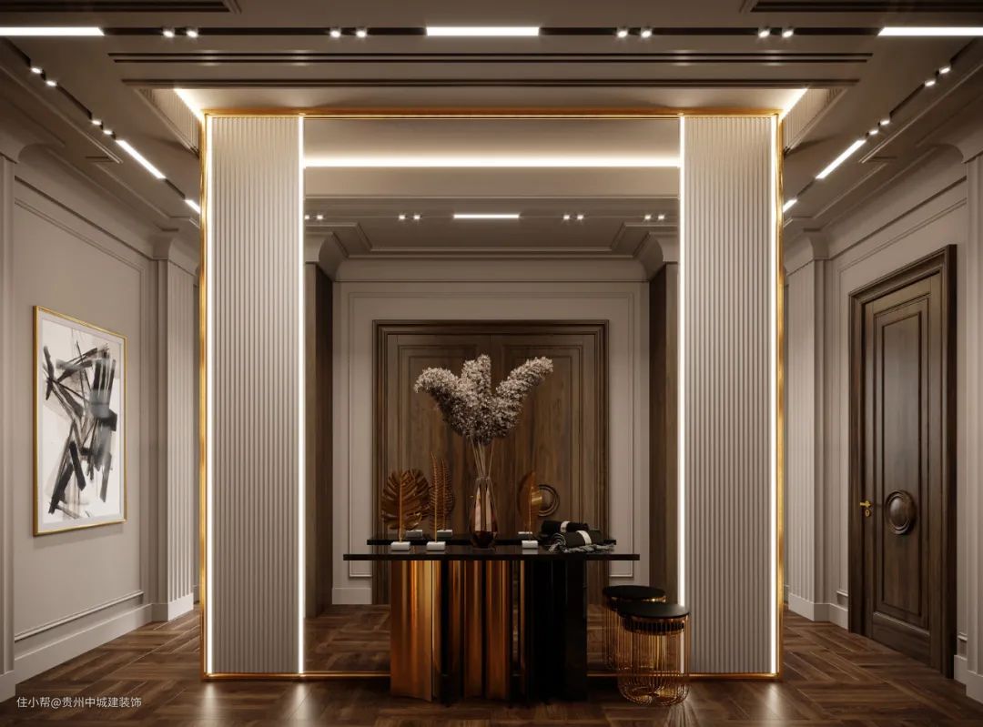 走道使用了暗铜色的设计,产生了沉稳成熟的视觉效果,隐藏的灯带分布在四周,看起来光亮优雅,这些特殊的元素赋予了室内特别的一面。