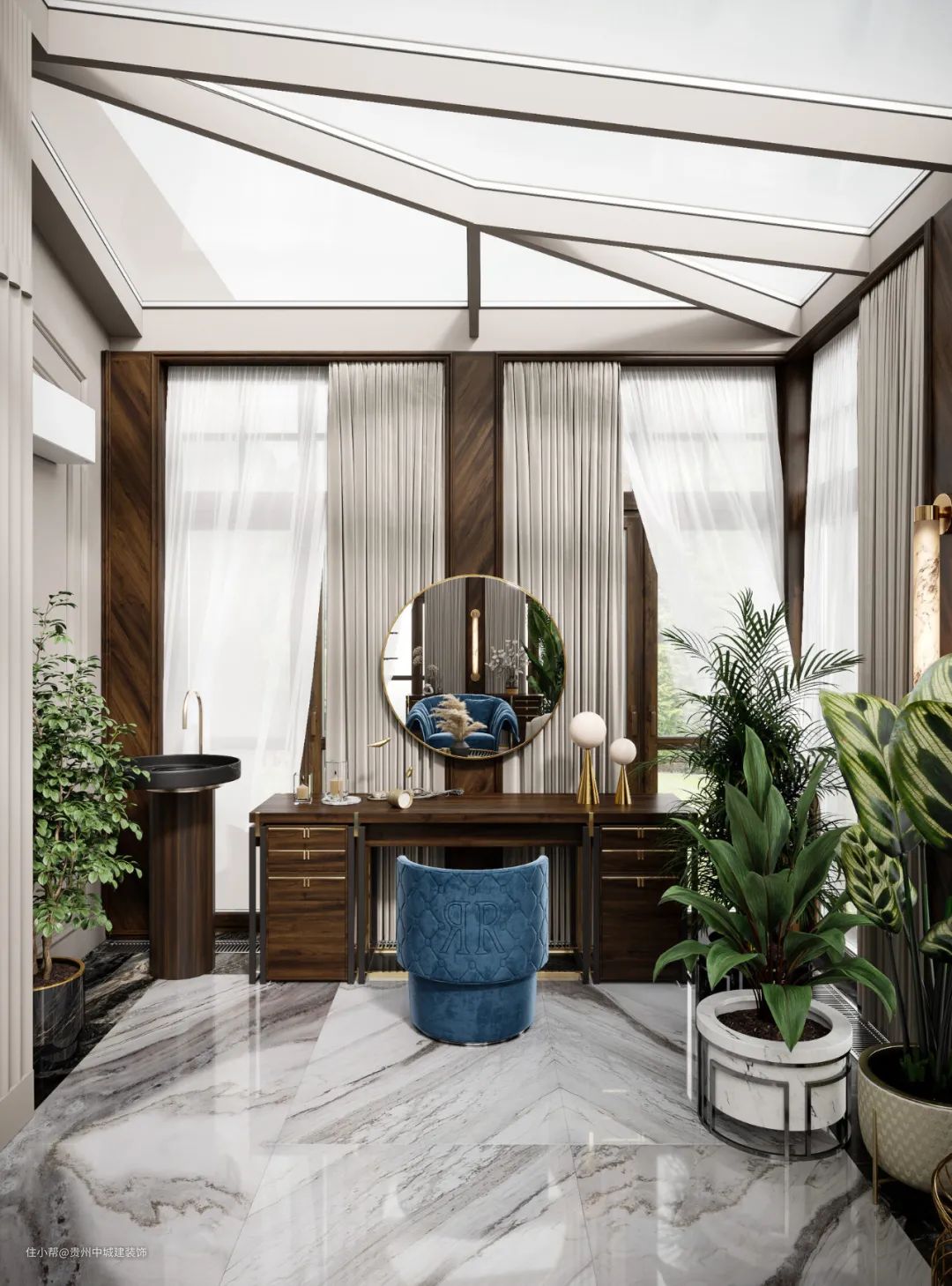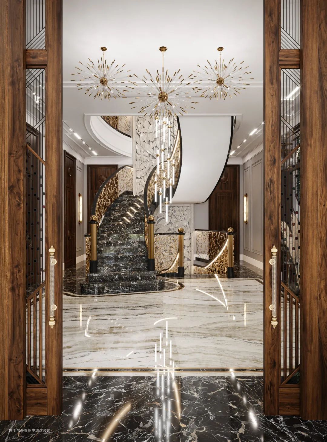 整栋新式的奢华别墅室内的奢华内饰和细节,无一不透露出设计师对业主个性和品味的揣摩,这种风格的设计挑战,若失败就是土气庸俗,但如果成功后,则是贵高级美学独特风格的最佳赞美。