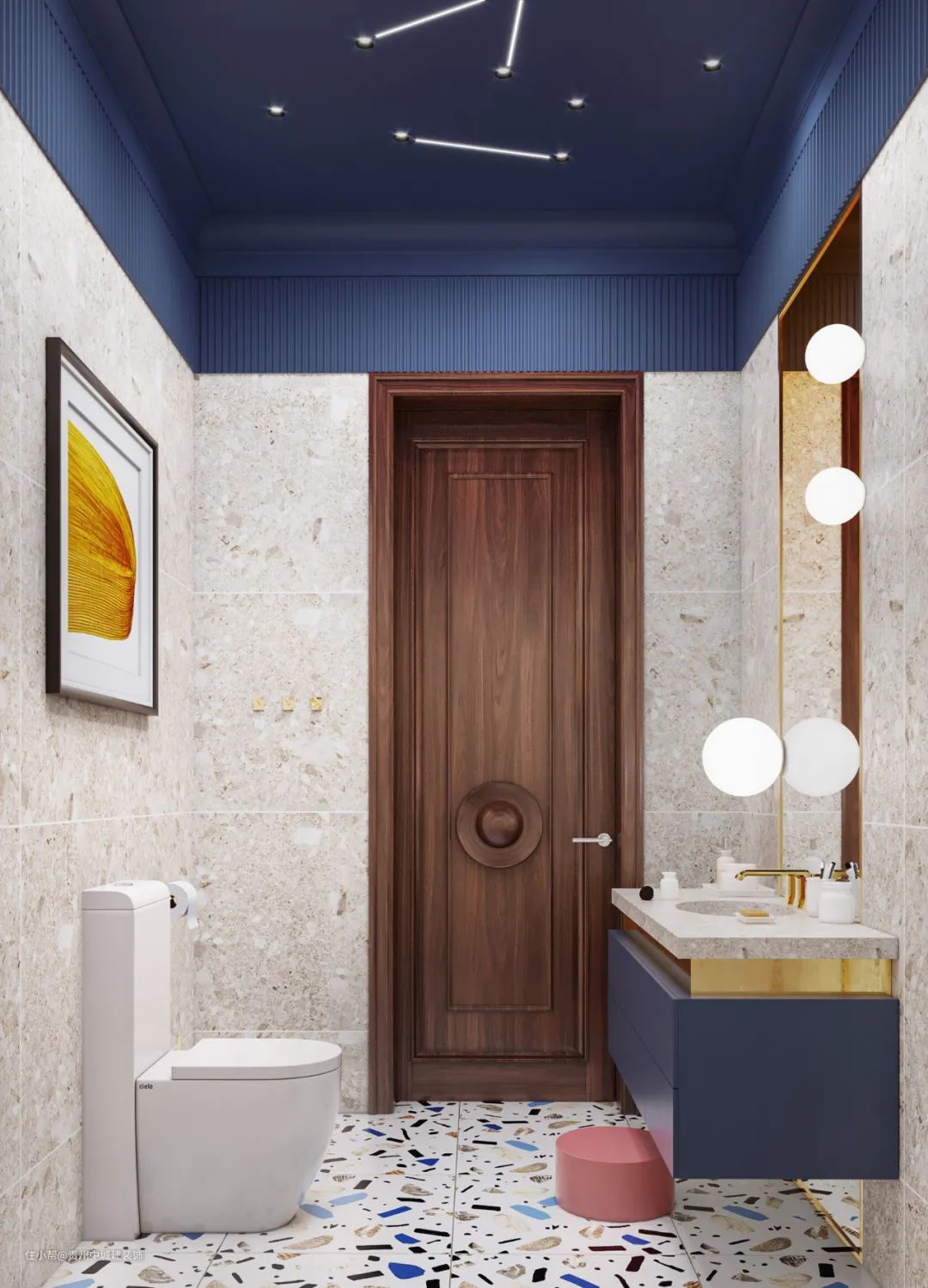 卫浴的天花板也采用星座的组合形式,照明的灯具如一轮明月悬挂在中间,从设计细节上来看简直无可挑剔。