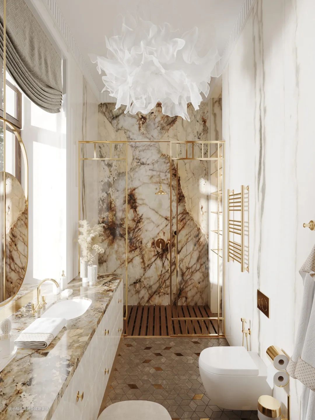 化妆间选用女性喜爱的轻奢材质,浅色的空间背景搭配细黄铜材质,如轻纱般的灯饰聚拢在上方,让人赏心悦目。