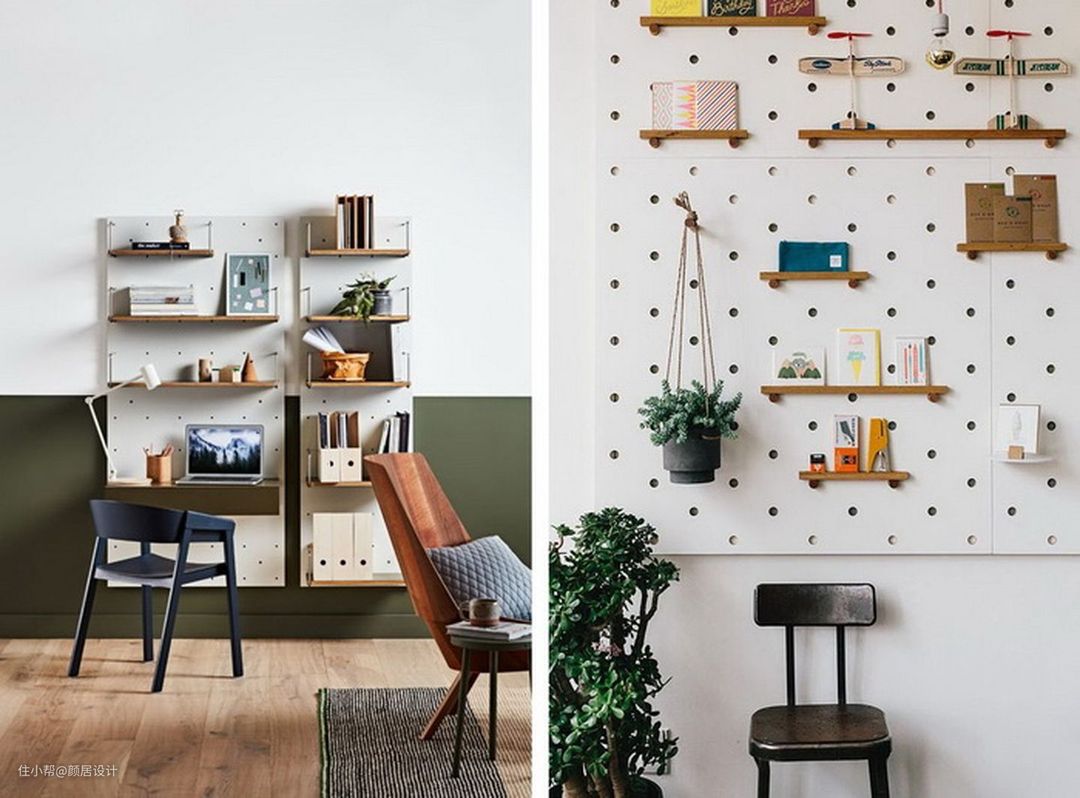 洞洞板:作为收纳工具的peg board,以圆洞木板为基础,可根据需求添加木棍、搁板、挂架、格子等,组成不同的功能和装饰区域。