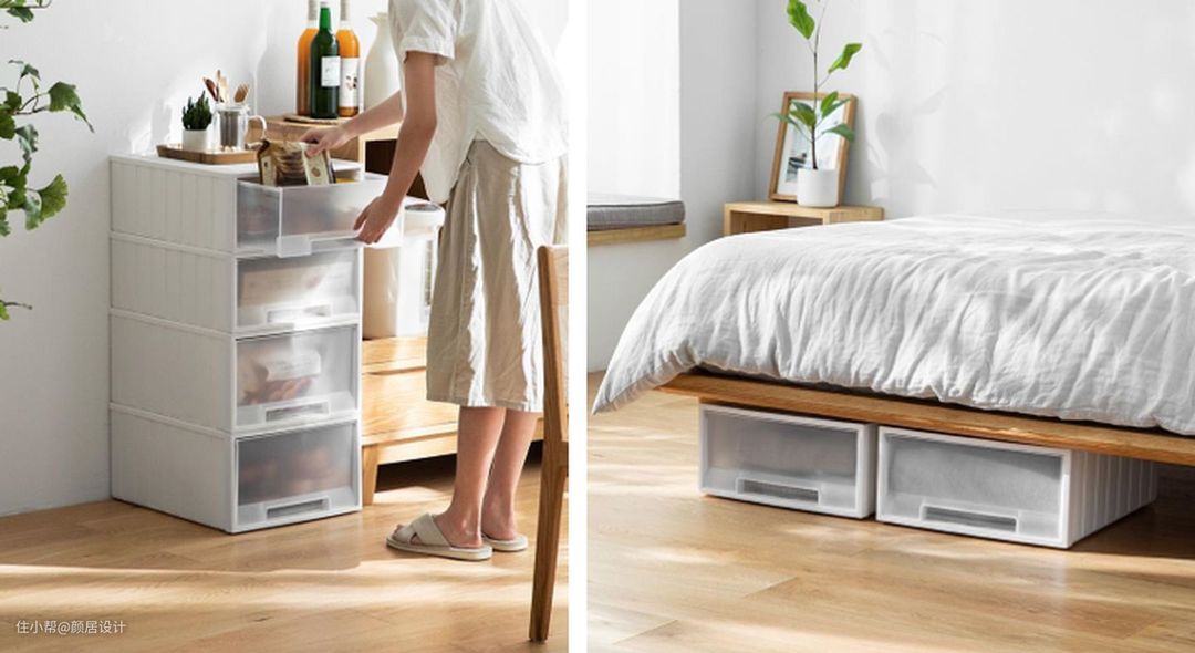 抽屉式透明储物收纳箱:哪怕是经过精细化设计的衣柜,通常挂衣区的设计也要预留一部分高度,比大多数的衣服要高一点,如果是买的普通的成品衣柜,那空间利用就更不充分了。透明则更易辨识内部物品,抽屉式收纳更易拿取。
