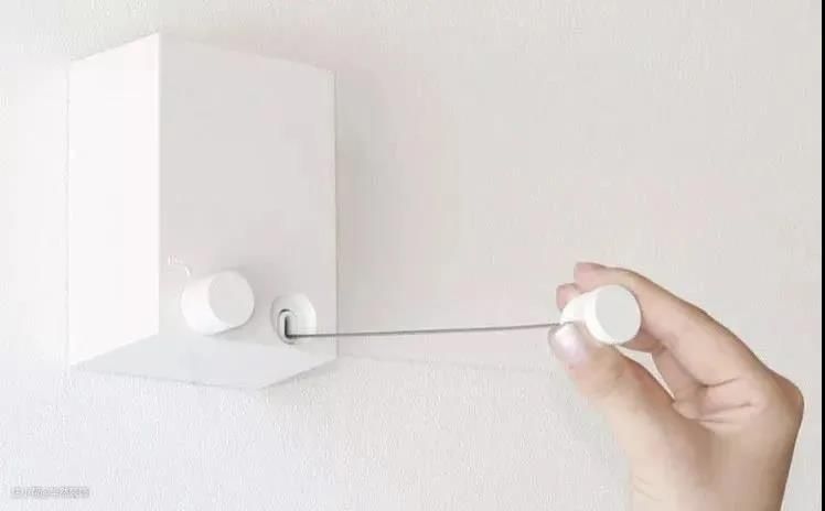 一个白色的小盒固定在墙上,另一边固定一个扣子,从小盒里拉出钢丝扣到扣子上,用取都很方便。但是缺点也很明显,不能承重太多的衣服,所以用这个的家庭大多数最后还是会搭配一个移动的晾衣架使用了……