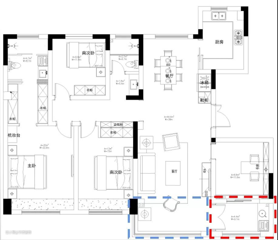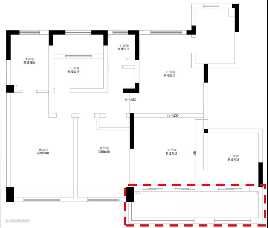 红框里的部分是原始户型的阳台,你没看错,真的只有1个阳台,但是好在与北边的设备平台相邻,都是“一家人”,借点面积造个晾晒区吧。