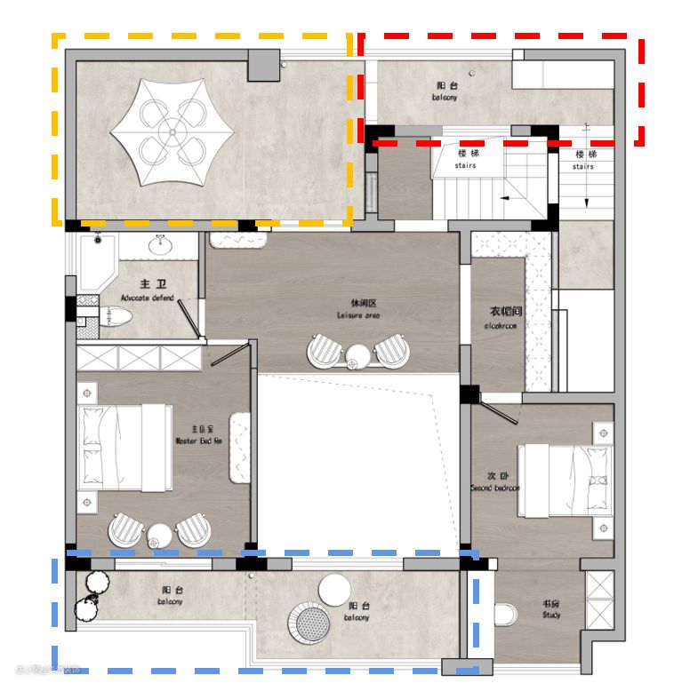 红框里为生活阳台,蓝框里为休闲阳台,黄色为休闲露台