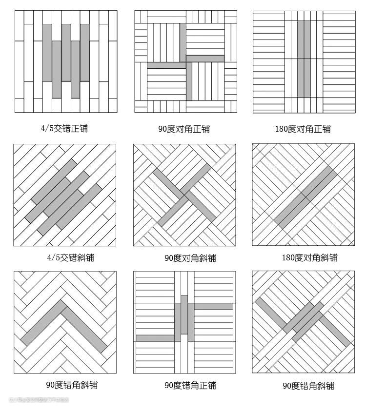其中4/5交错正铺是最常用的木纹砖铺法,铺出来层次丰富更真实。