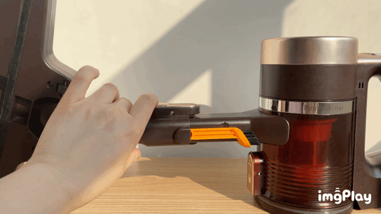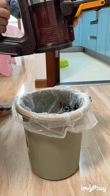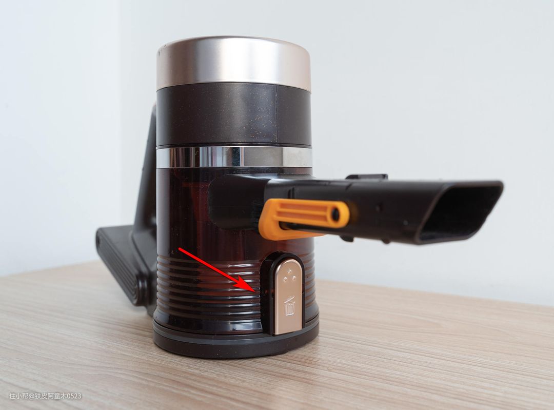 尘杯里的赃物怎么倒出呢?很简单,尘杯外部设有一银色按钮,轻轻一按,尘盒盖子即可自动打开,灰尘直接掉落垃圾桶中,不会脏手。