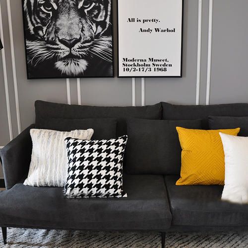 极具潮流感的黄与黑是十分个性的组合,用白色来过渡虽然能增添亮度,但仍容易腻味,由黑色变浅的沙发以及上方的橙色抱枕,轻松注入新鲜感。