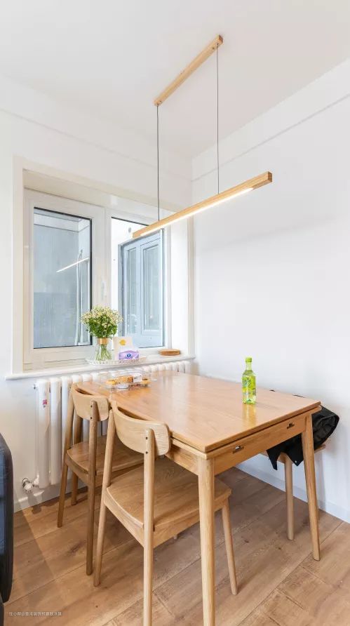 改造前,餐厅一角十分简陋。由于跟次卧在一区域内,怎么看都像是从卧室借来的空间直接摆了张桌子,太别扭。