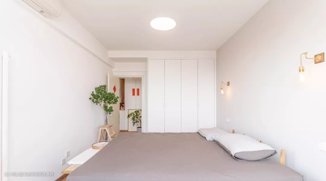 改造后,根据业主的喜好走极致性冷淡风。纯白色的大衣柜顶天立地直接到顶,解决了收纳问题。施工时还特意要求工人做了小吊顶。