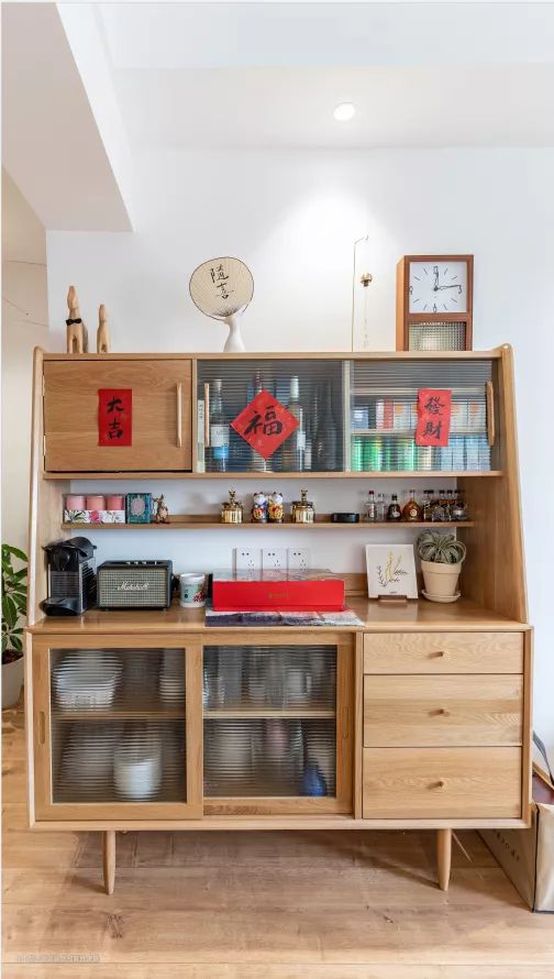 从宜家淘来的家具,轻松打造出日式原木风。小酒柜上摆放着各式各样有趣的小摆件,都是小两口热爱生活的象征。
