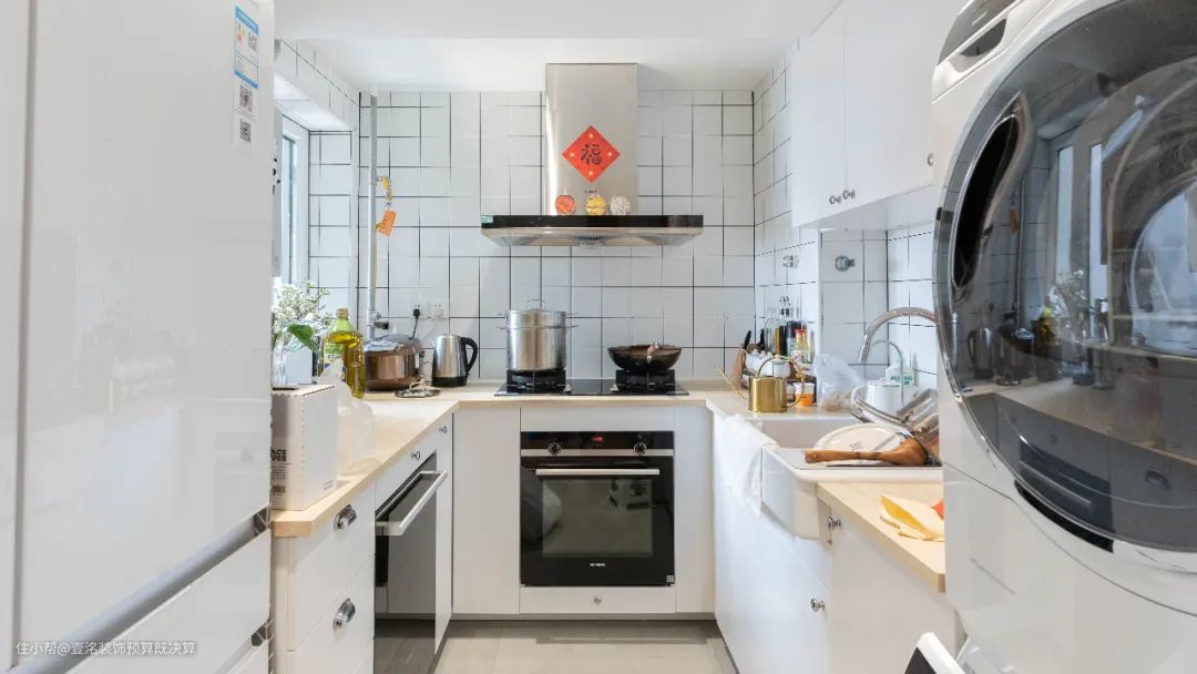 改造后,6平米的厨房做了U型橱柜。纯白色橱柜搭配木质台面,靠近门口两边分别是冰箱和洗衣区,靠墙处做一圈到顶橱柜,多少东西都能放进去。