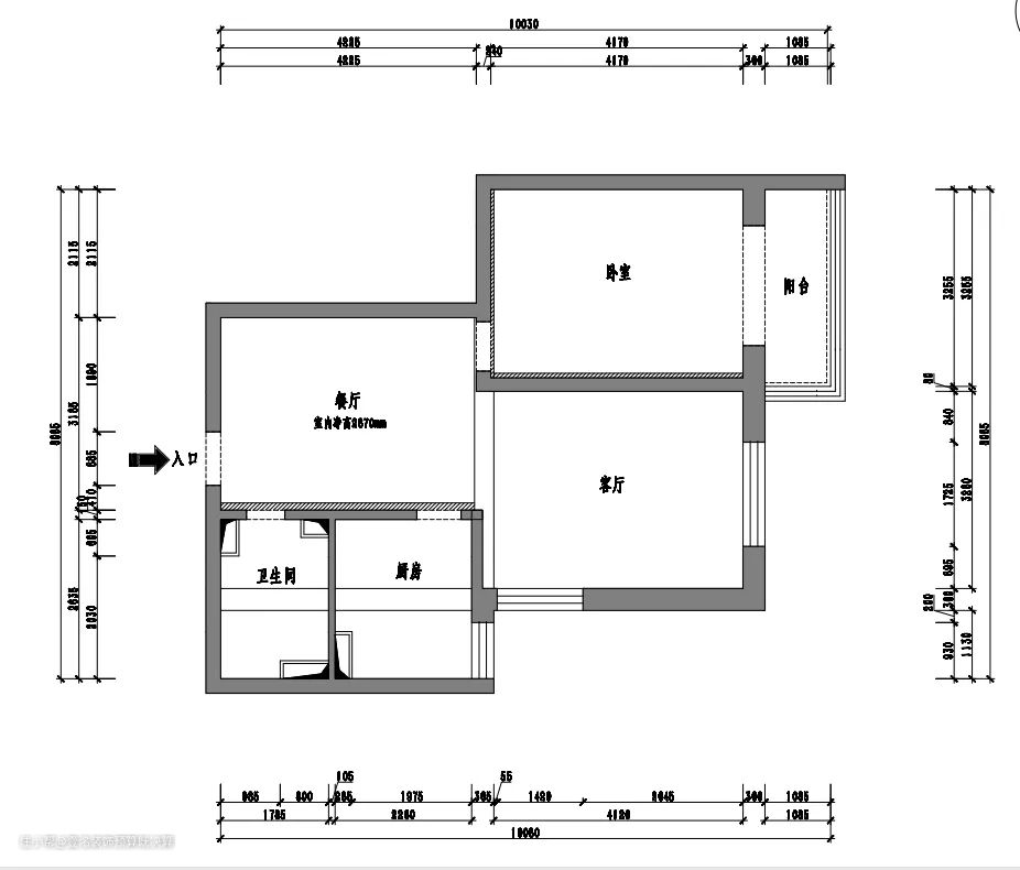 业主家的原始户型是个2室1厅。户型较为方正,没有死角。但最大的缺陷就是户型单面采光,进门处的客餐厅是个暗厅。没有窗户,白天吃饭也要开着灯。