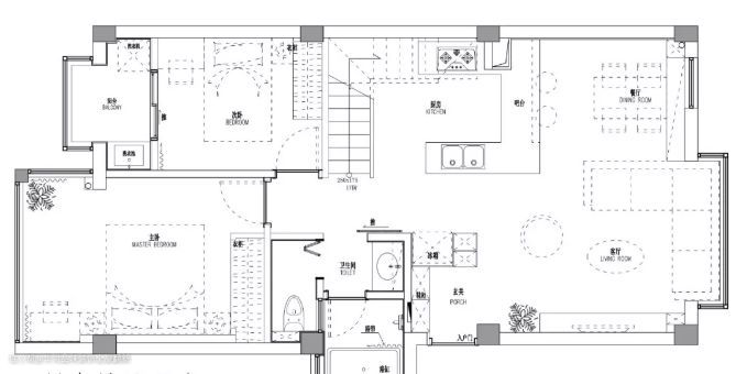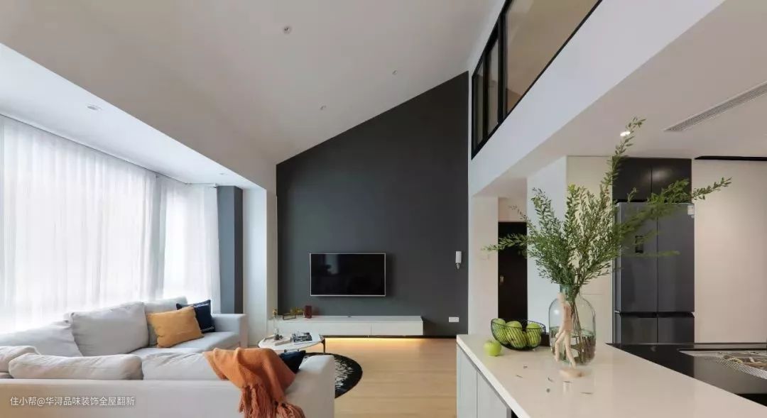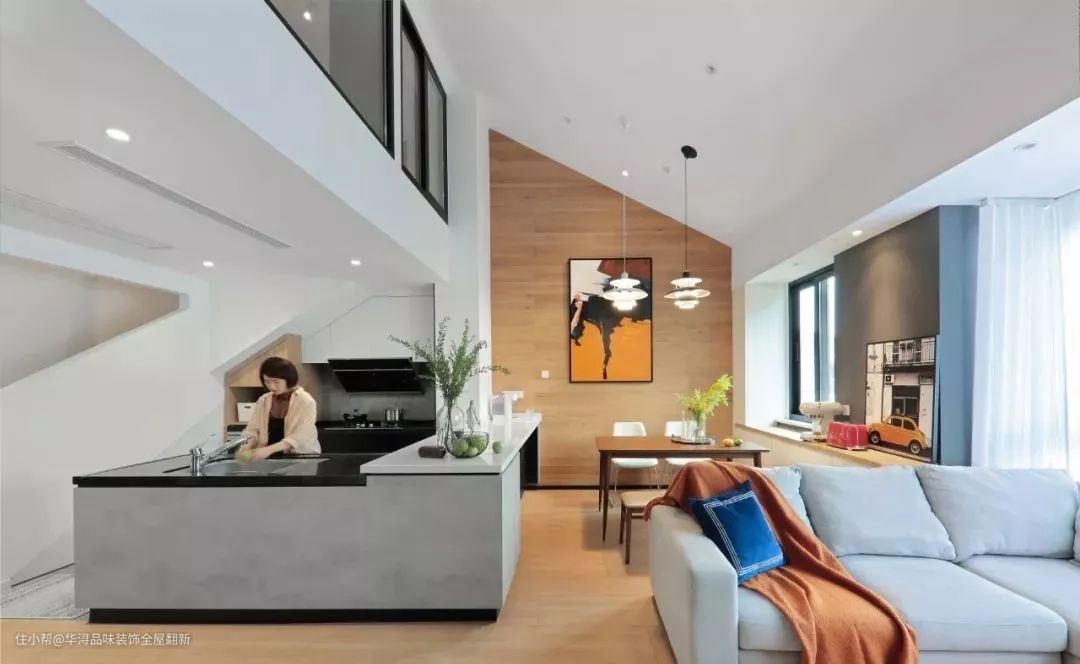 客餐厨全开放式,并且保留了房子原有的特殊构造,在餐厨区借助楼梯结构,做一些三角造型的呼应保留了原有建筑的美。
