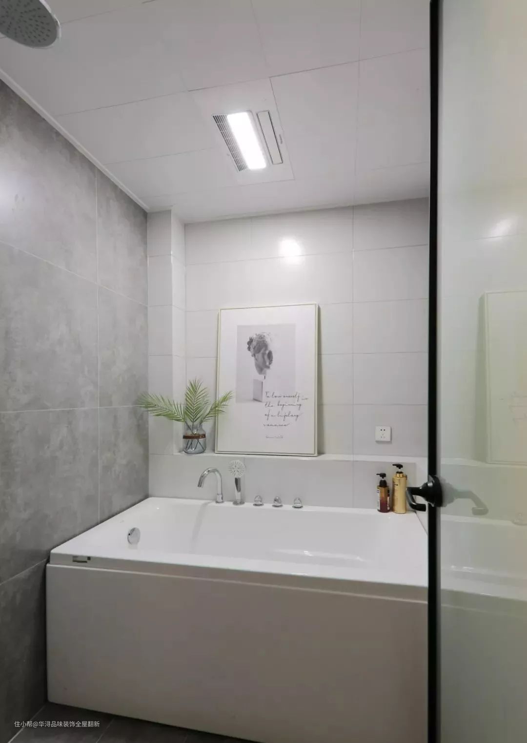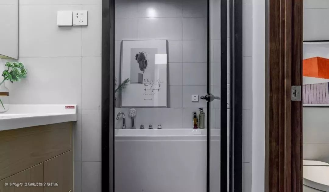 卫生间干湿3分离设计,各区规划实用经典,使用更方便舒适。浴室灰白为主调 ,马桶间空间较小,墙面更适合设计为单一浅色。