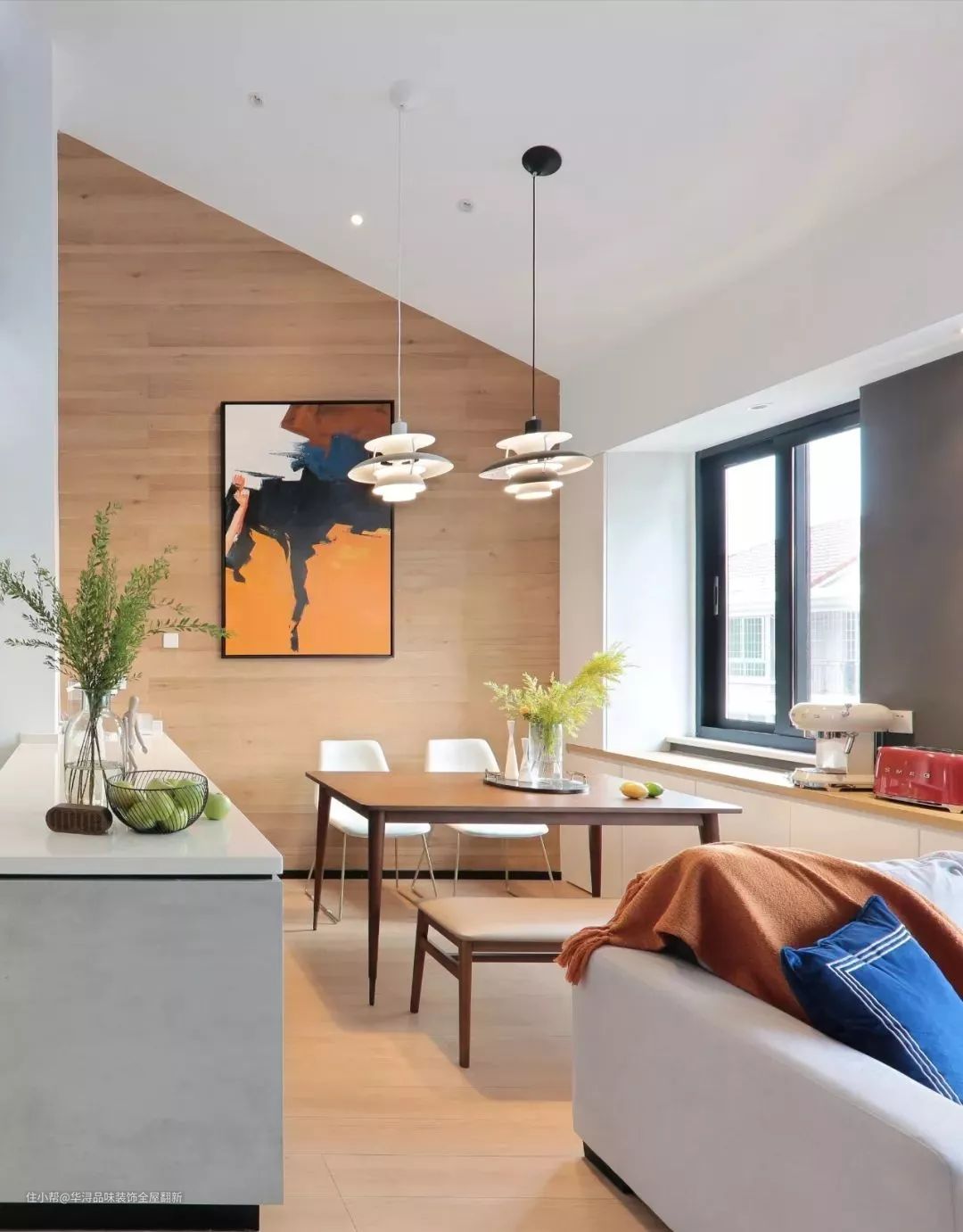 沙发背后就是餐厅区,选用温润木制餐桌,搭配两把椅子和长凳,简洁有错落,靠窗打造的餐边柜,放置着各种高颜值小电器