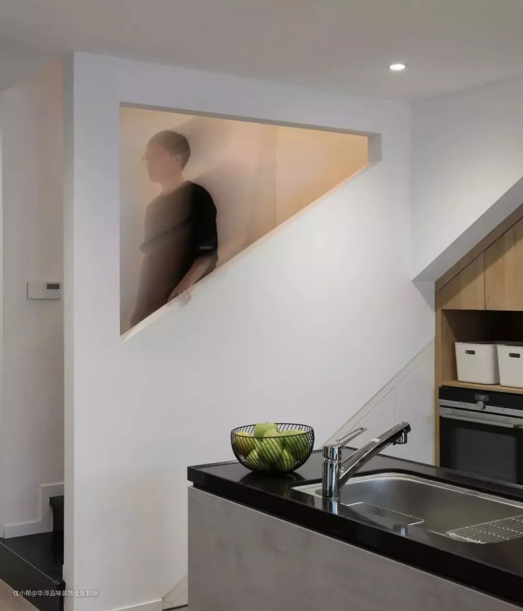 楼梯口面对卫生间,增设黑玻移门遮挡,楼梯井很实用地变成了厨房的一部分,人物在框里框外,出现也形成了有趣场景,斜边高度依循扶手高度合理设计。