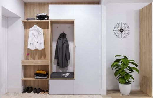 所以,充分利用进门处的转角区域,勾勒出一块专门用来悬挂衣物、脱换鞋子的地方,可以大大便利于我们的日常生活,提升整体舒适度。