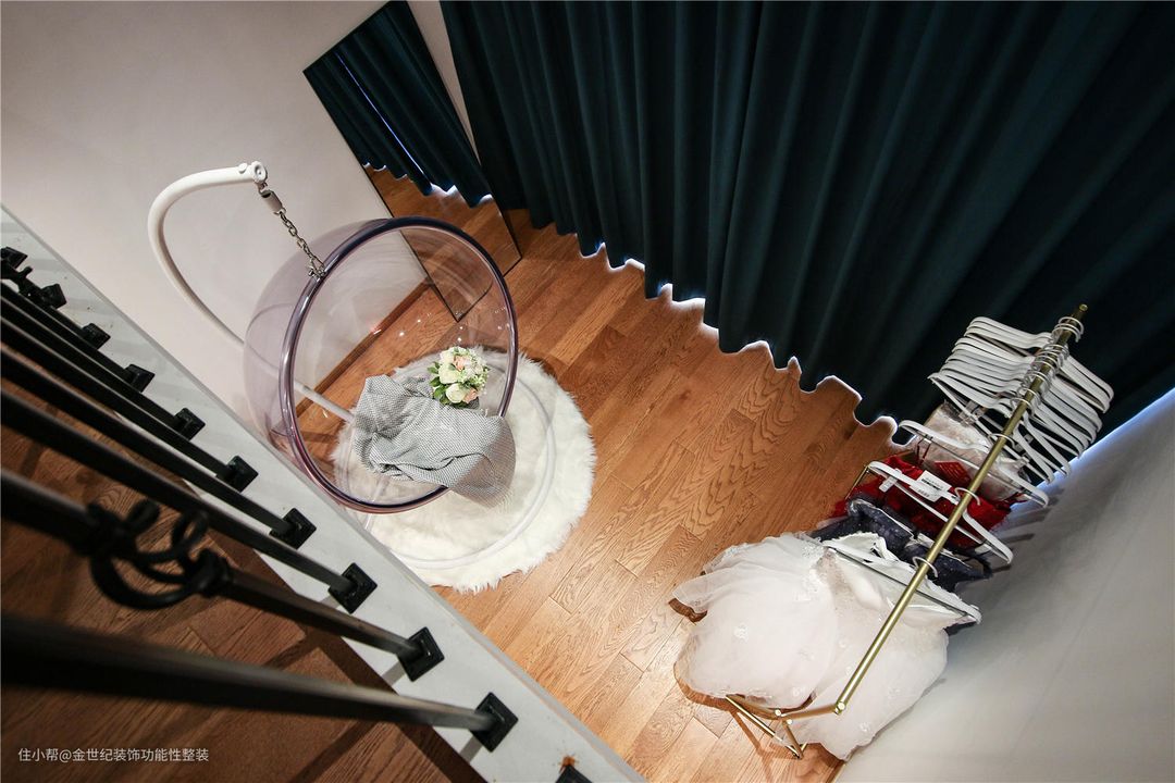 #飘窗 #“有特色”是整个房间设计过程中设计师考虑最多的一词。吊椅、婚纱礼服、瑜伽球等元素的加入丰富和明确了房间的设计主题,写真、拍照留念,休闲娱乐为一体,针对年轻时尚青年