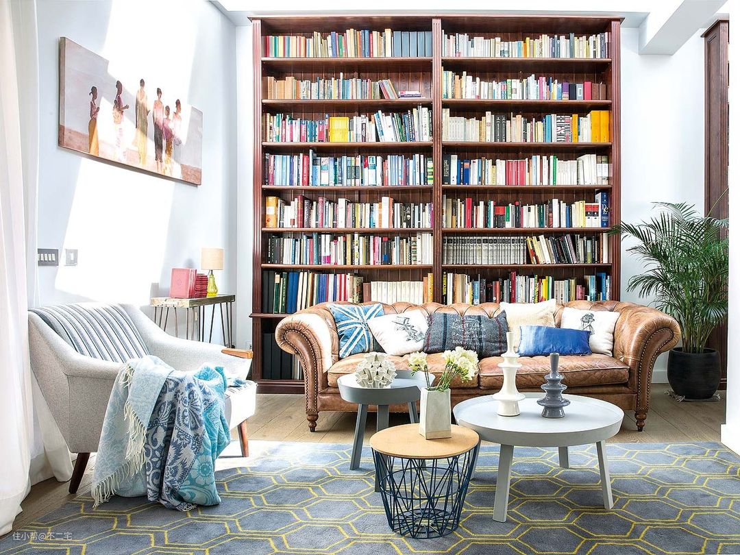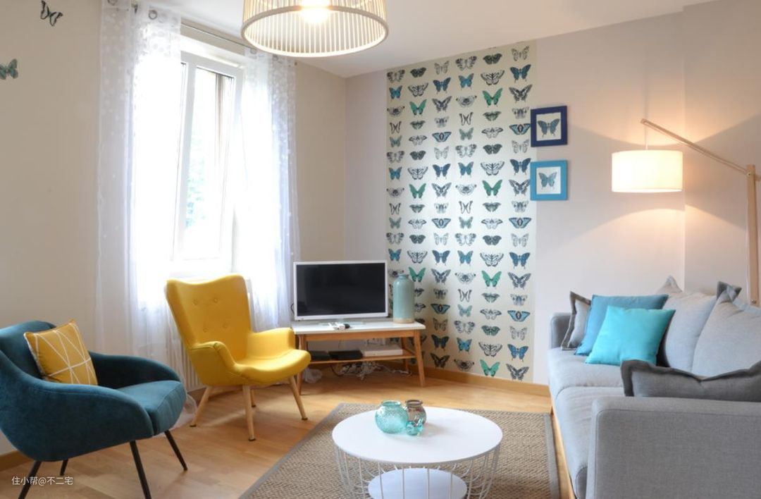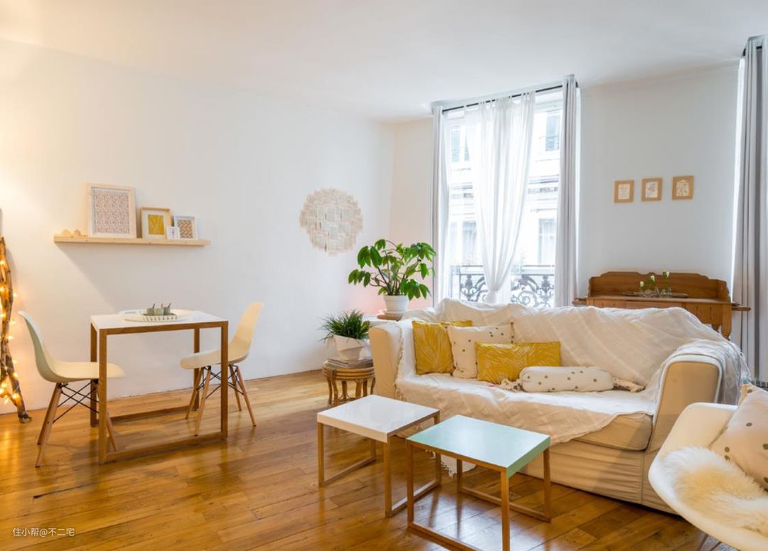 家具宜小。客厅面积不大,完全可以不用配置一整套组合沙发,选择2/3人座作为主沙发,再添置两张扶手椅其实就足够了,再配置一张小巧的茶几即可。家中偶尔来客人怕不够坐的话,还可以准备几张可折叠的椅子,不用时可收纳藏起来。