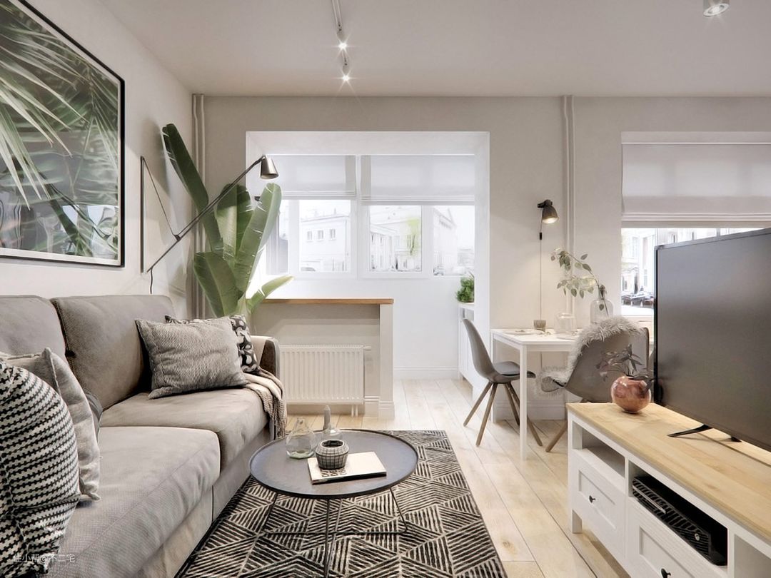 客厅面积小,适合使用浅色作为室内基调,浅色能让空间更明亮,以及具有一定的空旷视觉效果。如果大面积使用深色调,则会令空间产生压迫感,对于小空间来说无疑是雪上加霜。