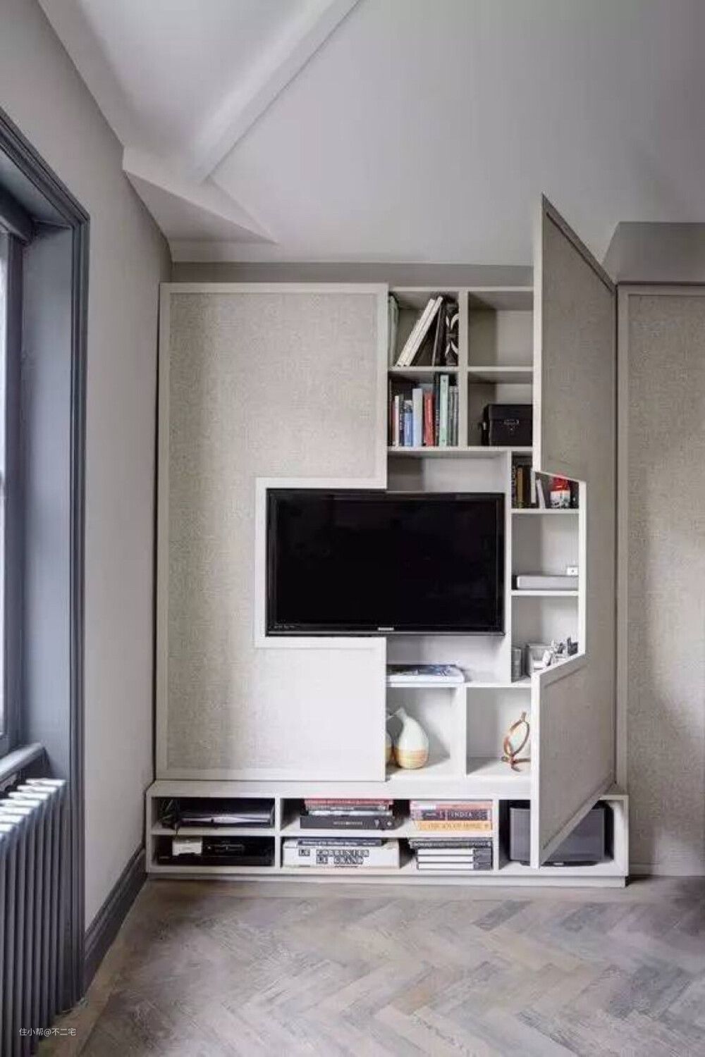 收纳电视背景墙。小客厅可利用的最大墙边空间之一就是电视背景墙,可以将整面电视背景墙设计成一个隐形收纳空间,日常生活中再多的杂物也可以尽收其中,这样一来就可能让客厅一直保持简洁干净的模样;再根据藏八露二的原则,做一些开放式的柜子,会更有设计感。