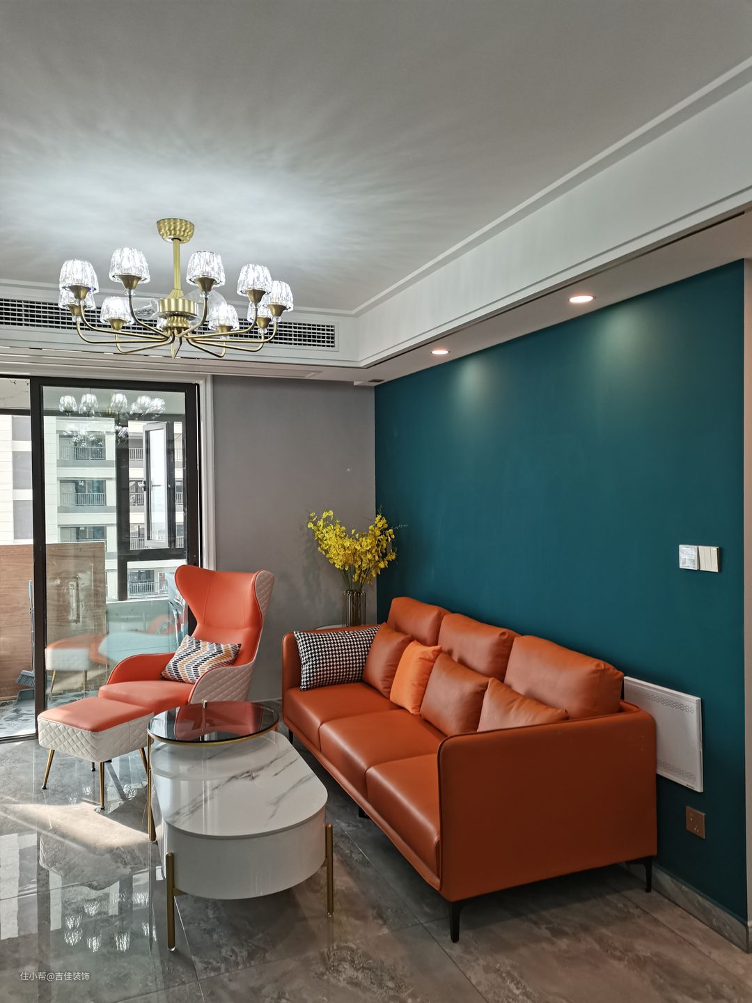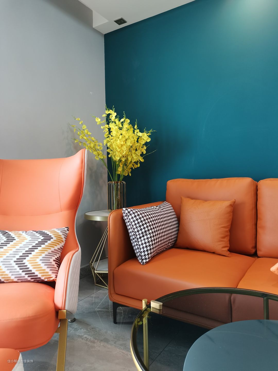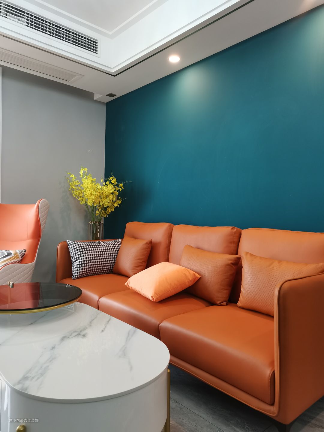 实拍实景,爱马仕橙色沙发搭配蓝色墙布