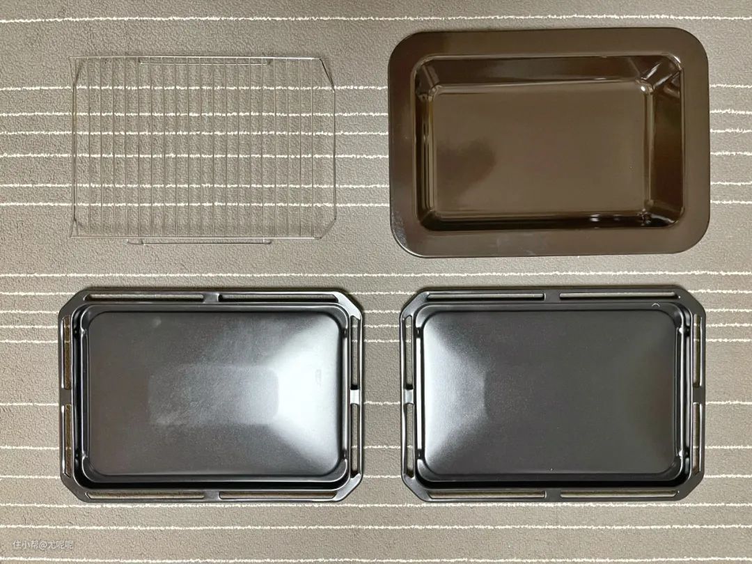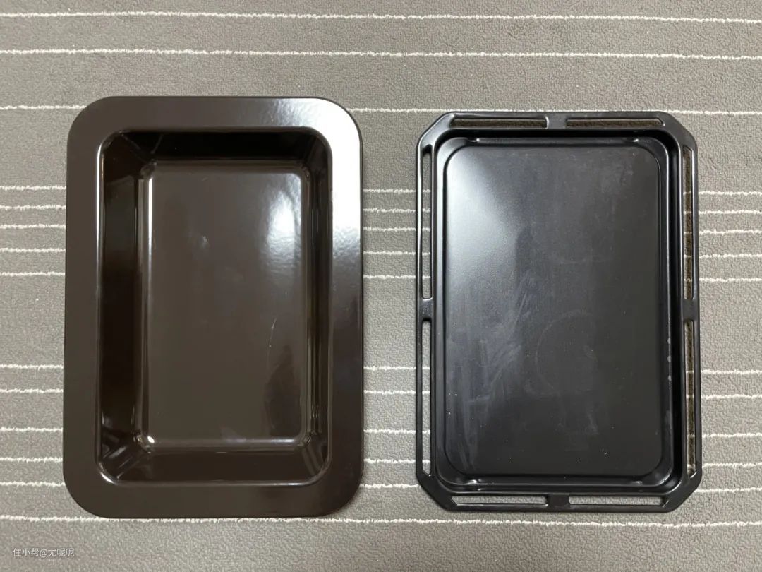其中浅烤盘为纳米陶瓷喷涂设计 ,相比于普通喷涂来说表面颗粒更小,所以基本可以做到无残留,不过长期使用个人还是建议垫油纸这样更保险。深盘为陶瓷烤盘,其实清理起来也同样比较简单。