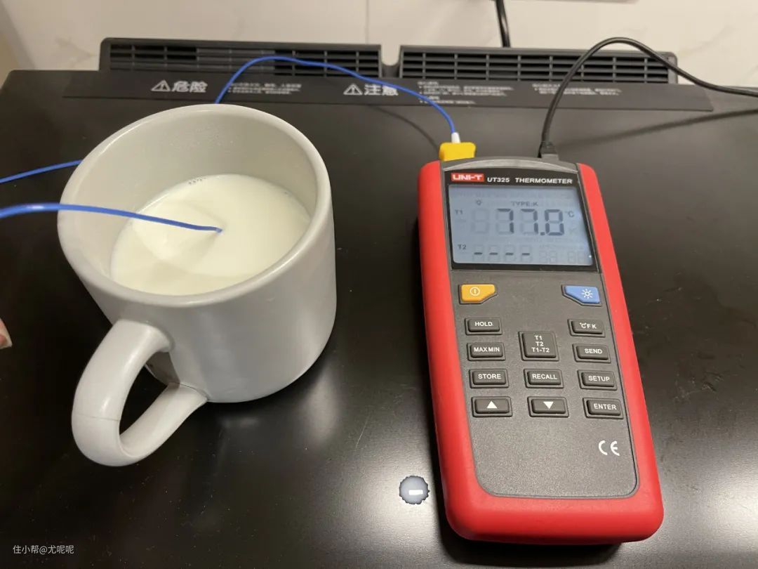 加热后的牛奶我使用测温仪进行了测量,经过自动程序加热的牛奶,会从室温加热至77℃左右,这个温度正好让奶香味很浓,而且可以出奶皮。