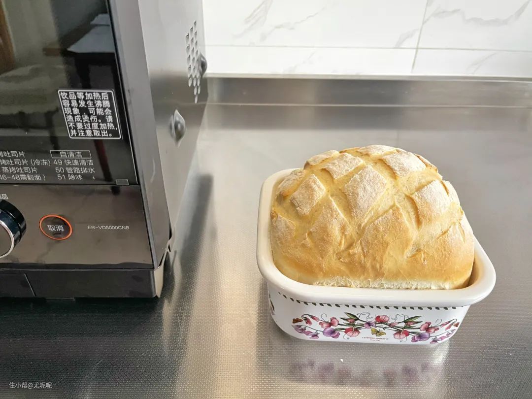首先把需要烤制的面包进行发酵,第一次发酵是为了面团的蓬松,第二次发酵是为了让面包更细腻。可以看见经过水波炉两次发酵后的面团,很轻松的就能割出漂亮的纹理发酵十分成功。(发酵比对图在“蒸”的功能测试中)